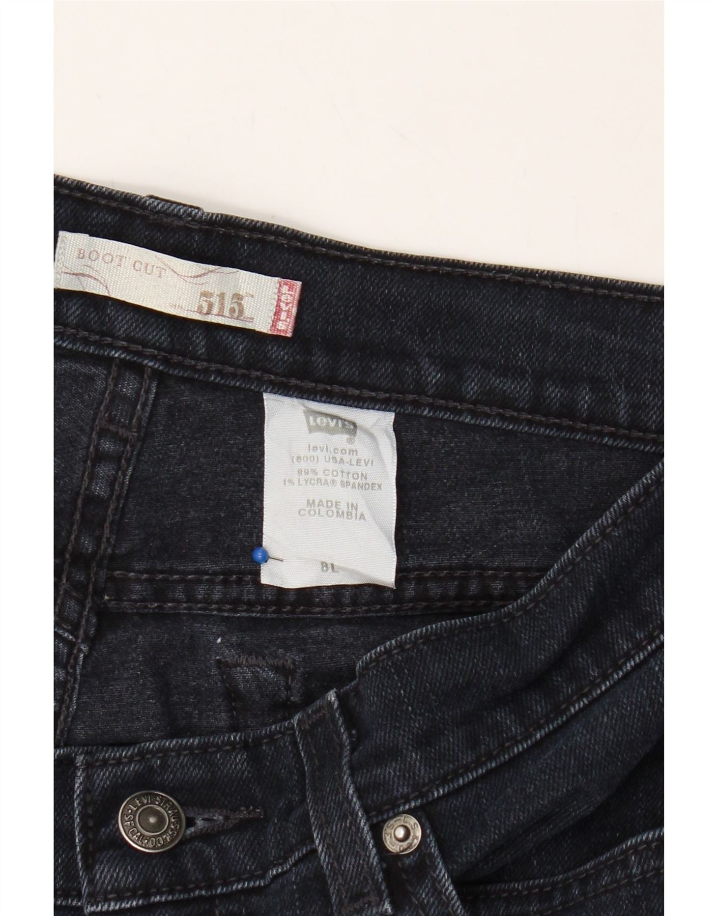 - AI Description: These pre-owned Levi's 515 bootcut jeans for women offer a classic silhouette in a versatile navy blue denim. Crafted from a comfortable stretch denim composed of 99% cotton and 1% Lycra spandex, they provide a regular fit with a button closure. Features include practical pockets and subtle button accents. Made in Colombia. The stretch fabric and bootcut leg offer a flattering and timeless style.