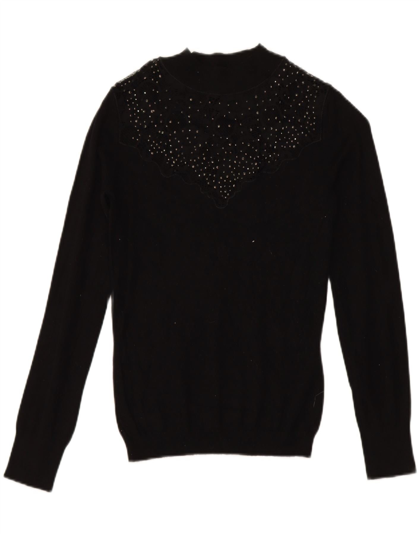 - AI Description: This Lipsy jumper is a stylish addition to any wardrobe. Crafted from a comfortable knit fabric, it features a classic round neck and long sleeves. The regular fit ensures a flattering silhouette, while the beaded accent adds a touch of sophistication. In excellent pre-owned condition, there are minor signs of wear including loose stitching and discoloration on the collar and neck. Size US 8.