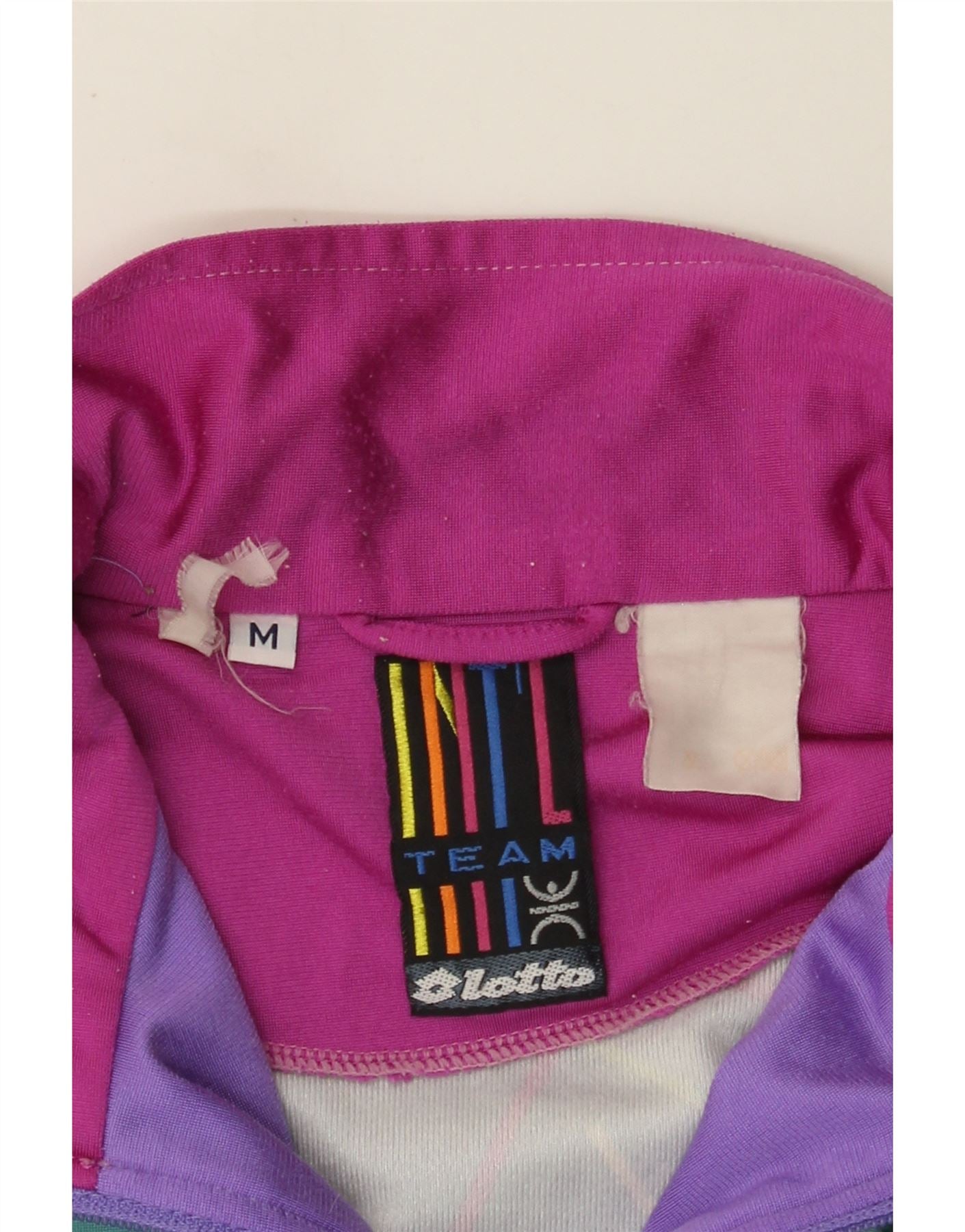 - AI beskrivelse: Denne Lotto vindjakke til mænd er lavet af et glat jerseystof. Den har en livlig lilla base med slående grønne og lyserøde geometriske mønstre. Den høje hals og fuld lynlås giver praktisk dækning. Lange ærmer og en normal pasform sikrer behageligt slid. Lynlåslommer giver sikker opbevaring. Den dristige 90'er-stil forstærkes af det karakteristiske geometriske design og mærkelogo.