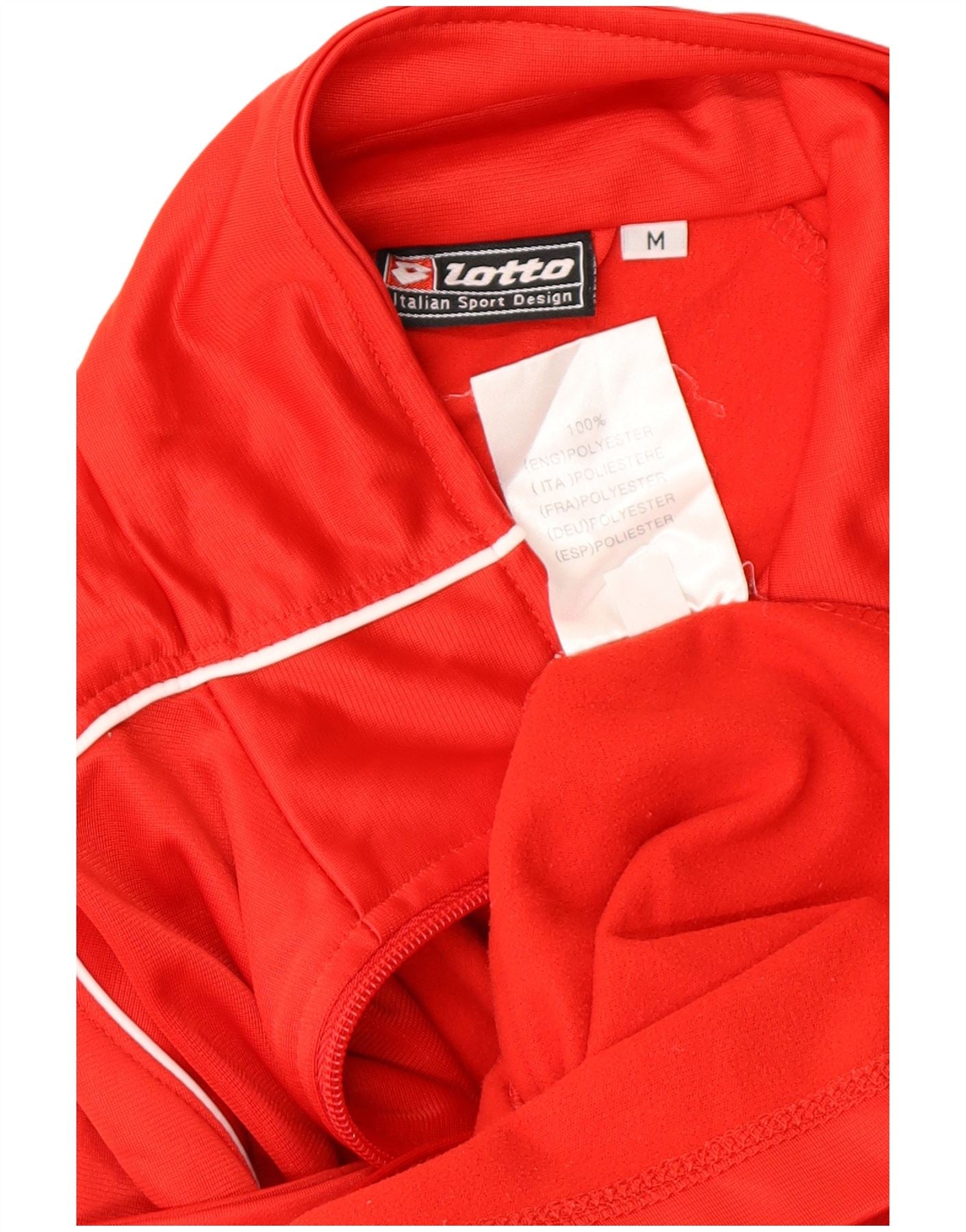 - AI beskrivelse: Denne Lotto træningsdragt top er lavet af glat rødt polyester strikstof. Den har høj hals og fuld lynlås. Lange ærmer giver rigelig dækning. Den regelmæssige pasform sikrer behagelig bevægelse. Hvide pipingdetaljer fremhæver skuldrene og frontlommerne. Et subtilt mærkelogo er til stede på brystet. Dette stykke giver et sporty, men alligevel raffineret look.