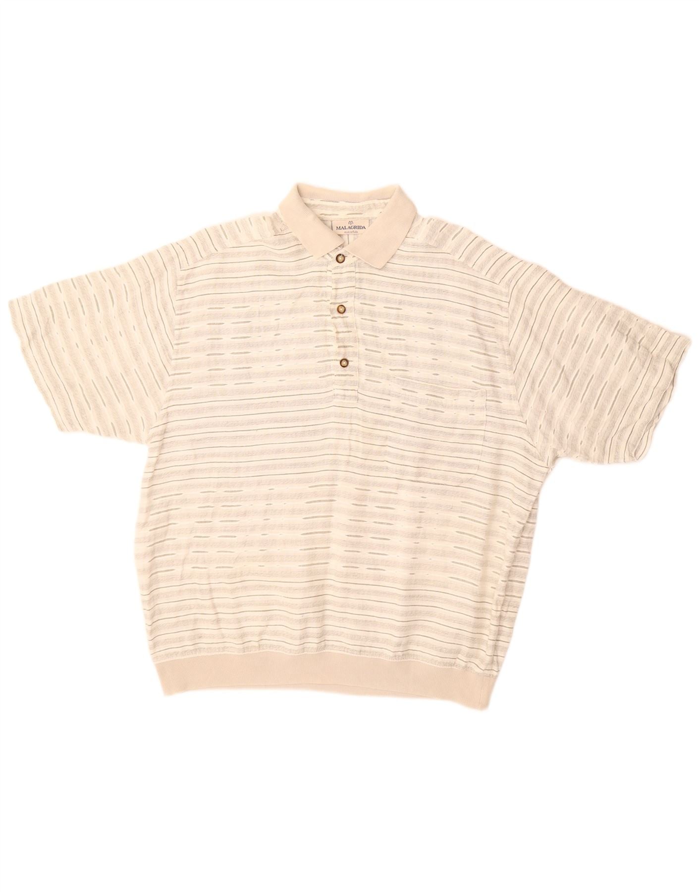 - AI beskrivelse: Denne Malagrida herre-T-shirt er fremstillet af 100 procent bomuldsstrik og tilbyder en blød, åndbar tekstur. Den har en klassisk halsudskæring og en knap foran for et raffineret look. Korte ærmer og en normal pasform sikrer behageligt slid. Det beige stof er detaljeret med et subtilt stribet mønster, der tilføjer visuel interesse. En lille lomme på brystet giver praktiske detaljer.