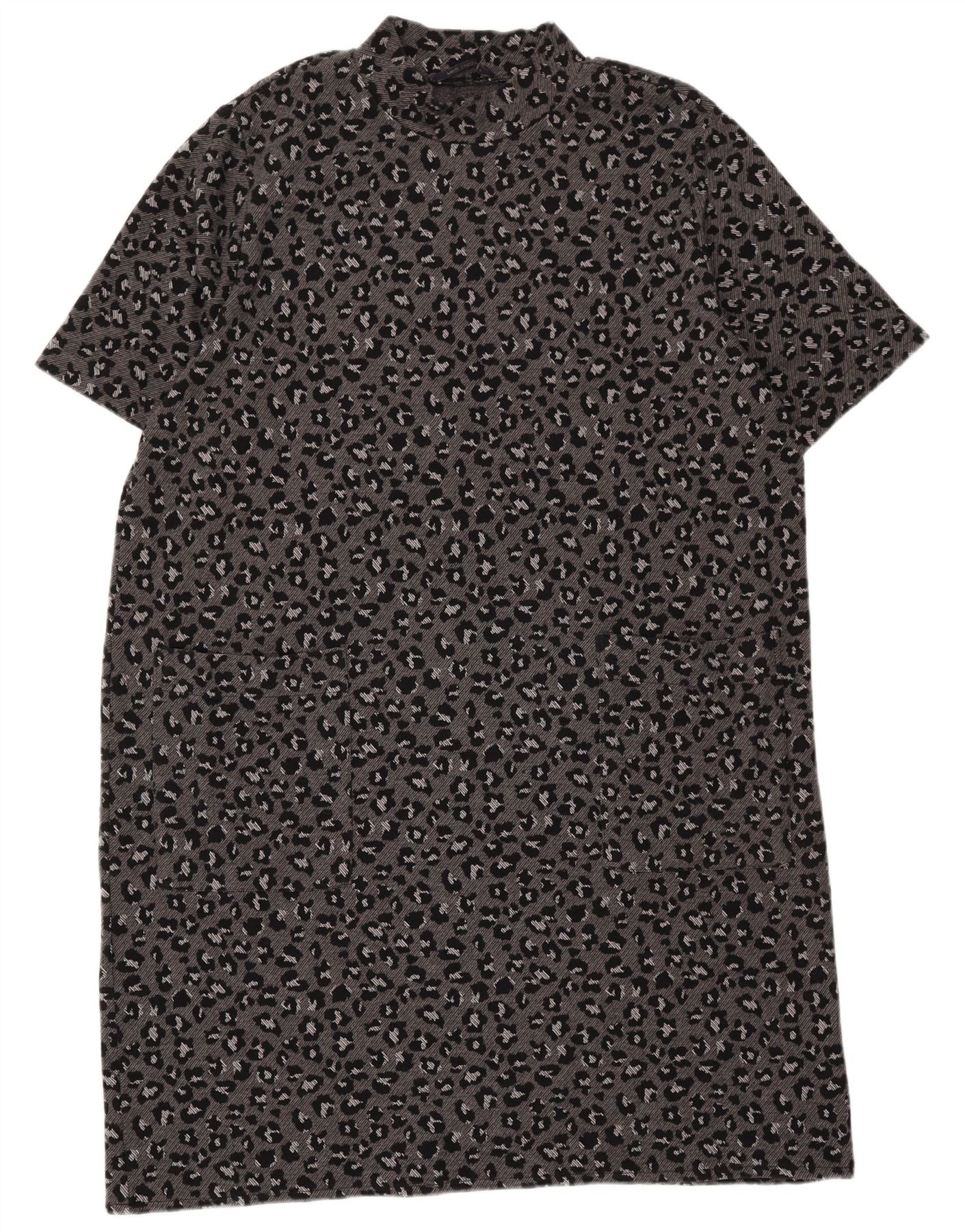- AI Description: This Marks & Spencer womens T-shirt dress is crafted from a soft grey knit fabric, offering a comfortable feel. It features a stylish mock neck and short sleeves. An eye-catching animal print adorns the entire garment. The regular fit ensures a relaxed yet flattering silhouette. Its pullover design makes it easy to wear, perfect for effortless everyday style.