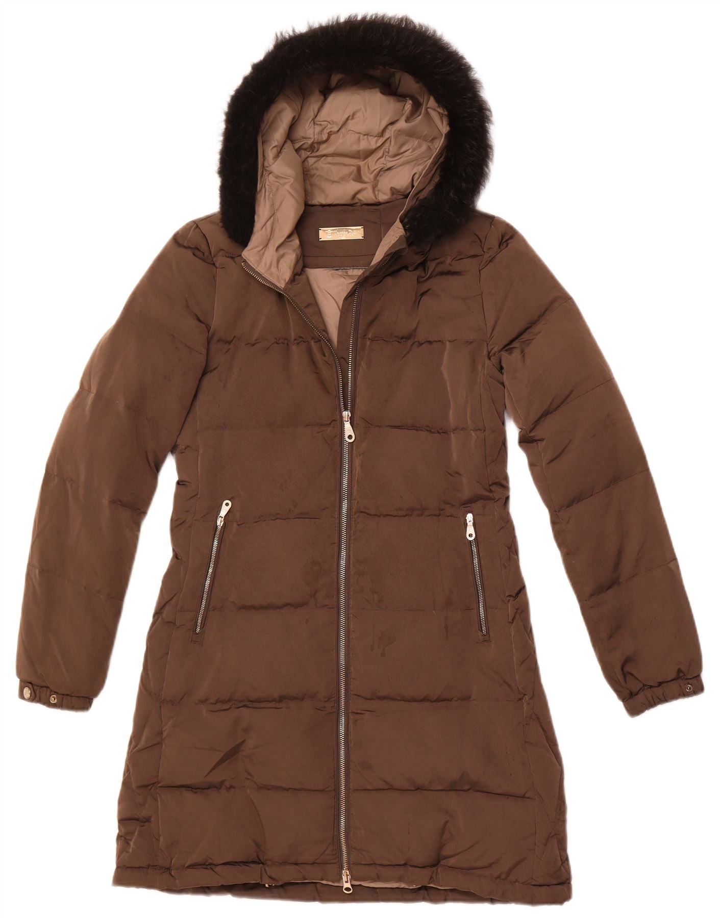 MASSIMO DUTTI Dame hætte polstret frakke UK 10 Lille brun polyester