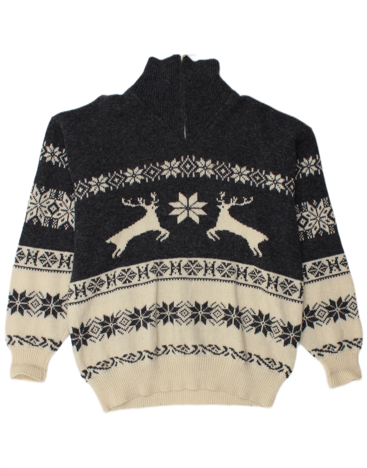 MC NEAL Mens Graphic Zip Neck Jumper Sweater Large Grey Fair Isle Wool