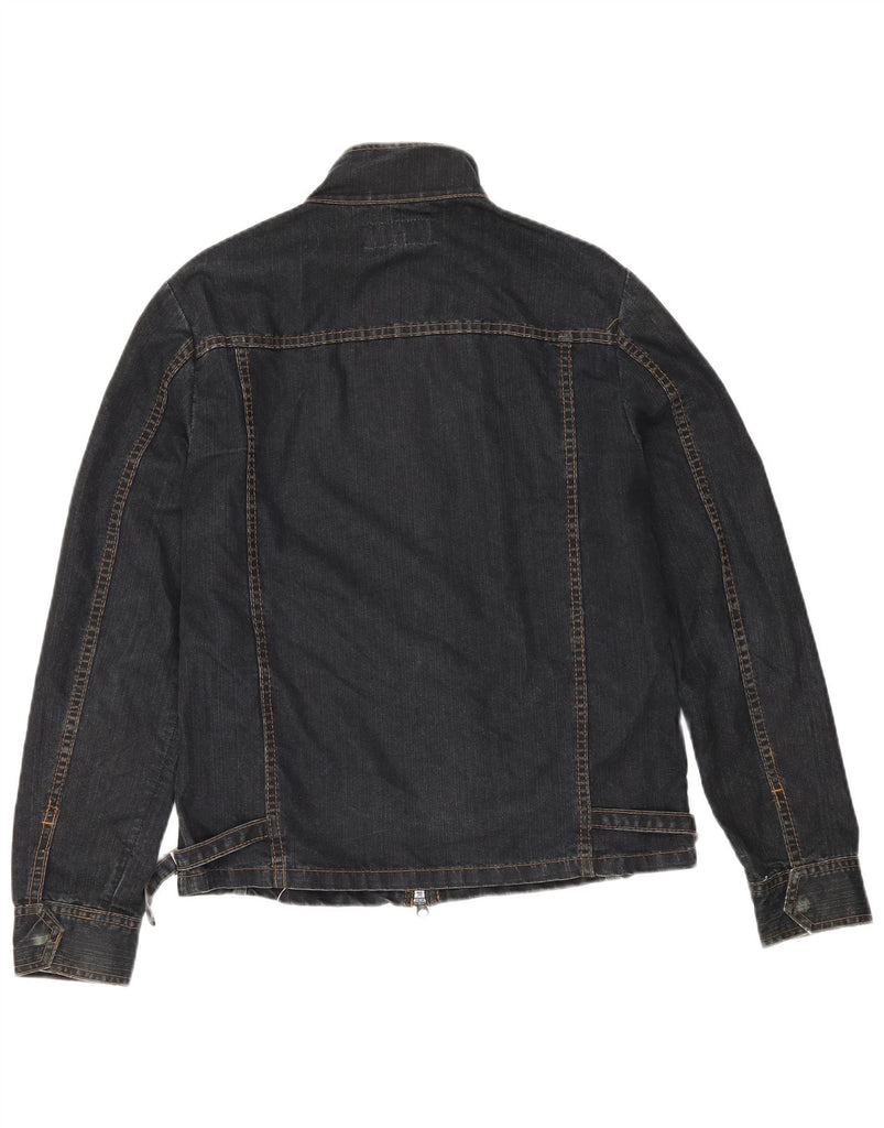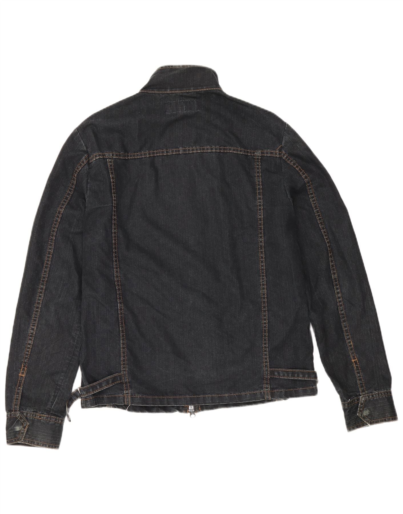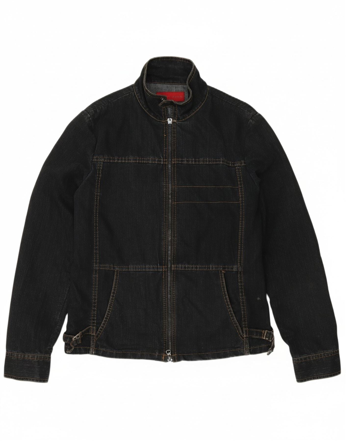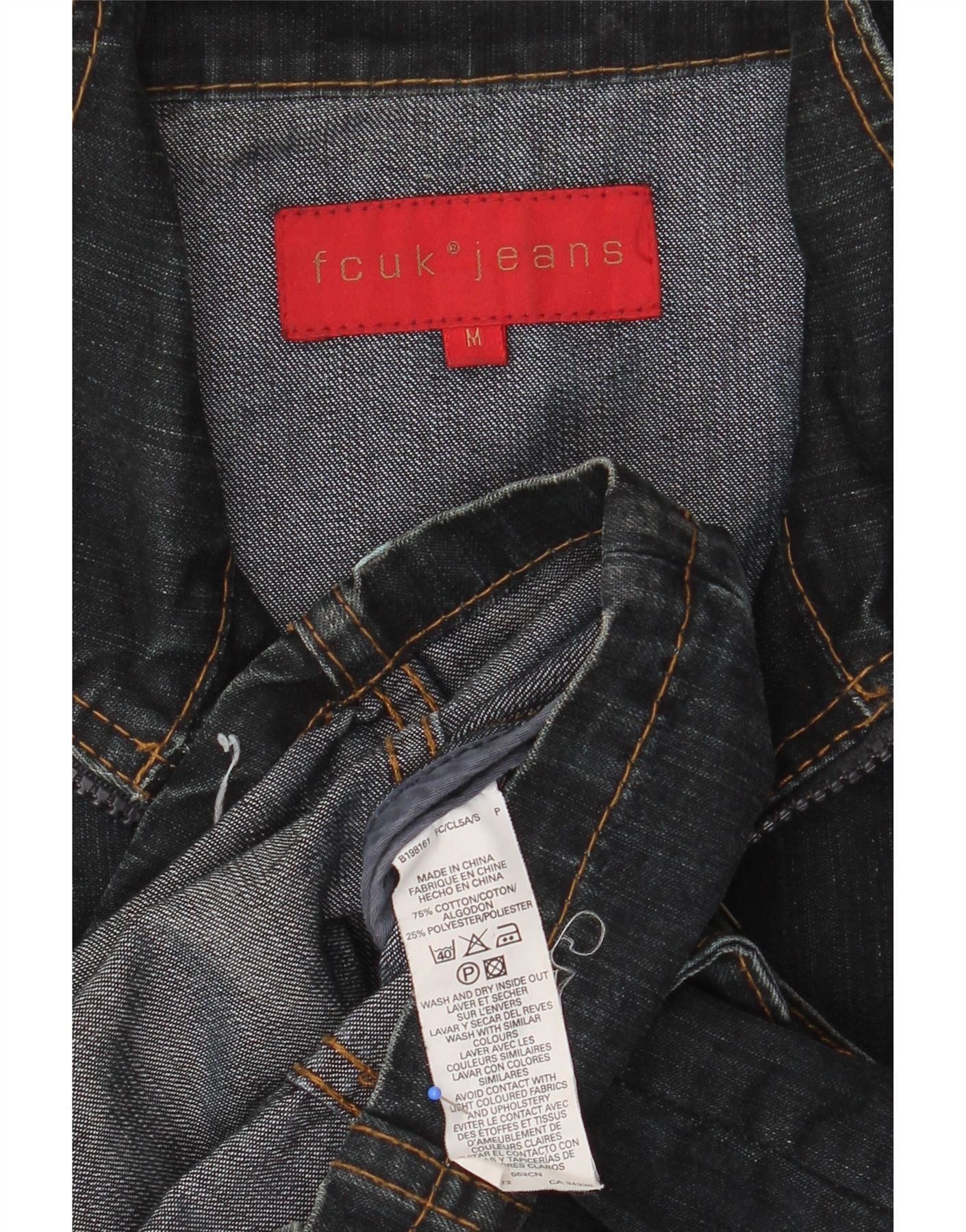 - AI Description: This FCUK men's denim jacket is crafted from black denim in a blend of cotton and polyester. It features a collared neckline and long sleeves for a classic style. The regular fit ensures comfort and ease of movement. A full zip closure and adjustable waist provide a customisable fit. Pockets add practicality, while the zip detailing gives a modern edge.