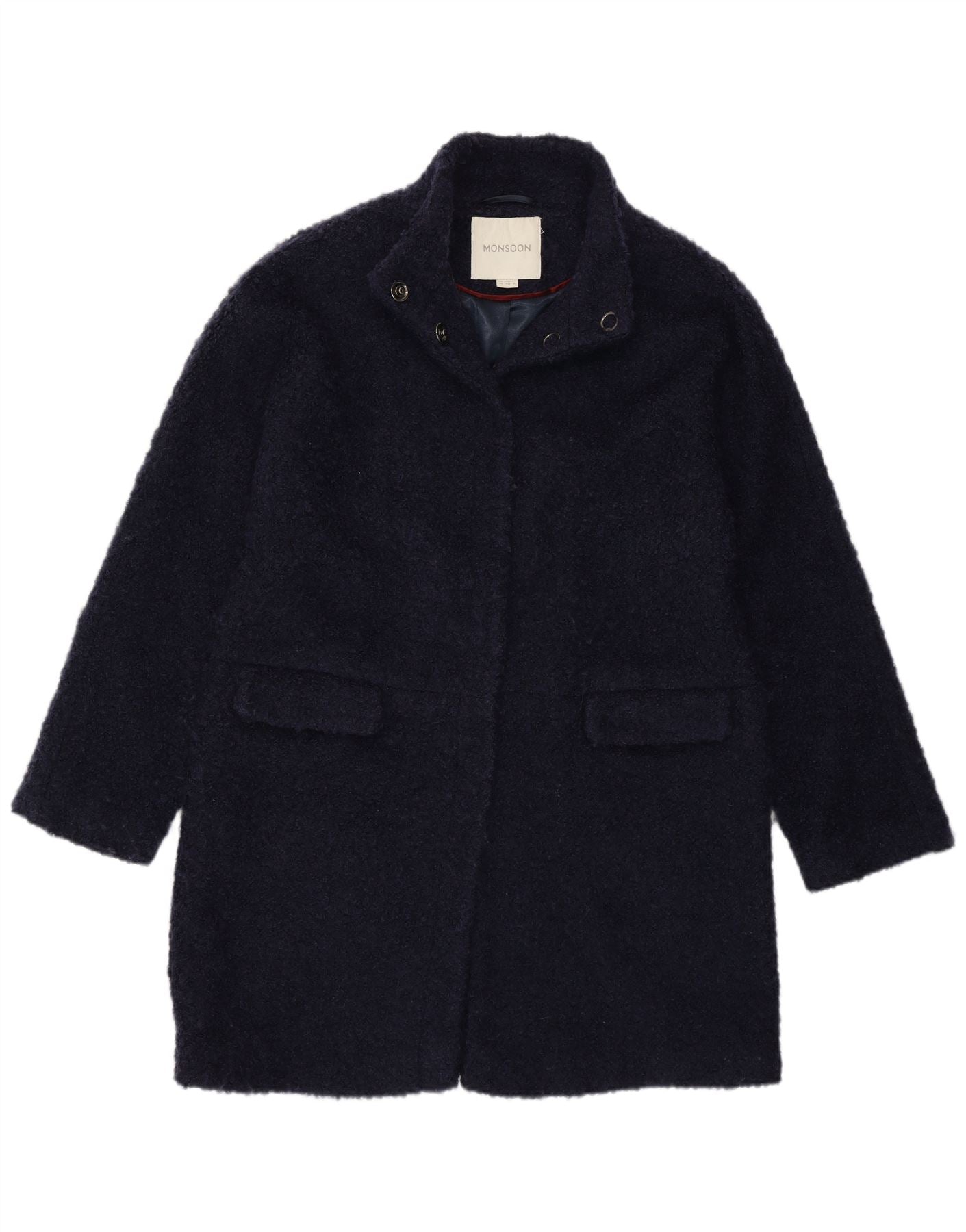 - AI beskrivelse: Denne Monsoon damefrakke er lavet af en rig marineblå akrylblanding med en karakteristisk boucle-tekstur. Den har en halsudskæring og lange ærmer, der byder på en klassisk vintersilhuet. Den almindelige pasform sikrer behageligt slid. Skjulte trykknapper giver en slank front. Praktiske lommer er integreret, og frakken er fuldt foret for varme. Tonale knapper tilføjer subtil accent.