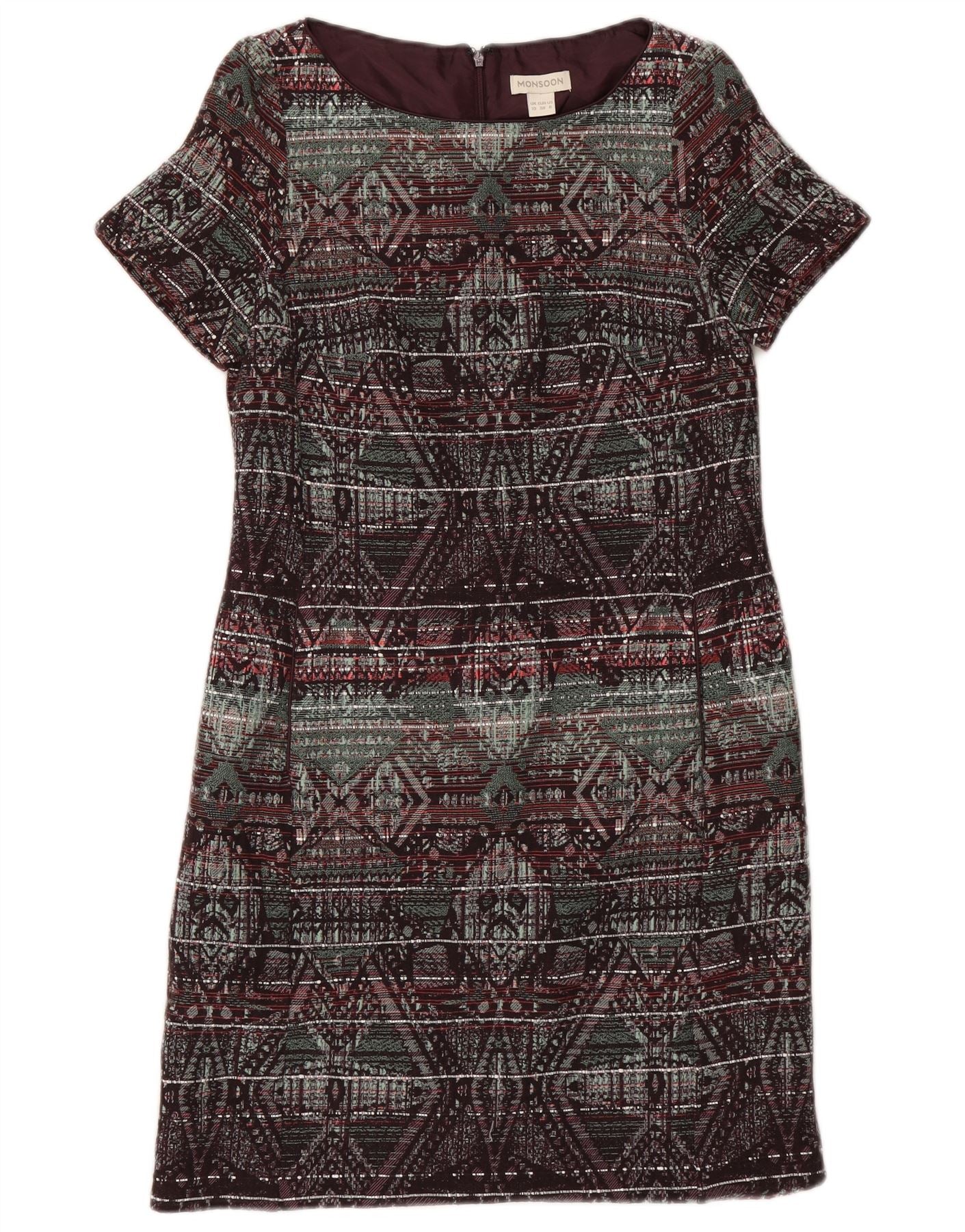 - AI beskrivelse: Denne skiftekjole til kvinder fra Monsoon er lavet af et rigt jacquardstof med en vævet tekstur. Den viser et slående flerfarvet geometrisk mønster, der blander bordeaux, grønne og sorte toner. Den runde halsudskæring og korte ærmer giver en klassisk silhuet. En normal pasform sikrer behageligt slid. Den er fuldt foret for komfort og har en diskret lynlåslukning bagpå. Det aztekisk-inspirerede design tilføjer et markant, stilfuldt touch.
