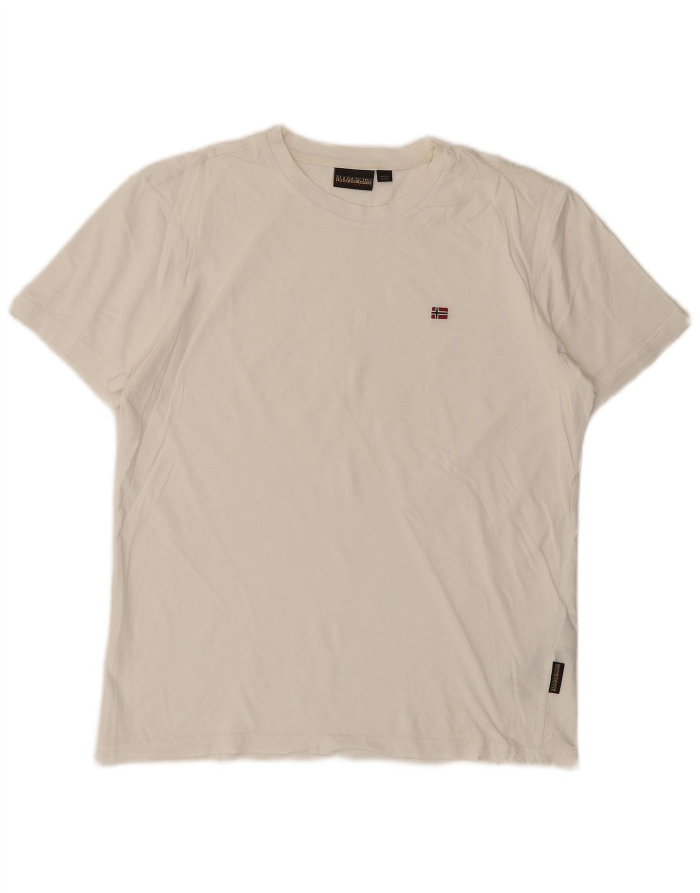 - AI beskrivelse: Denne Napapijri herre T-shirt er lavet af blødt offwhite jerseystof. Den har en klassisk rund hals og komfortable korte ærmer. Den almindelige pasform sikrer en afslappet silhuet. Et subtilt broderet logo på brystet tilføjer en signaturdetalje. Denne lette og åndbare top tilbyder hverdagskomfort og stil.