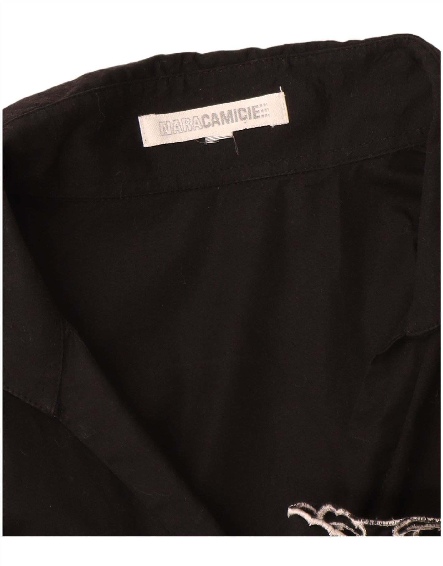 - AI beskrivelse: Denne Naracamicie skjortebluse til kvinder er lavet af et glat sort vævet stof. Den har en klassisk halsudskæring og en fuld knap foran. Lange ærmer giver elegant dækning. Den almindelige pasform sikrer behageligt slid. Indviklede hvide broderier pryder manchetterne og sømmen og skaber et slående grafisk mønster. Dette designerstykke tilbyder sofistikeret stil.