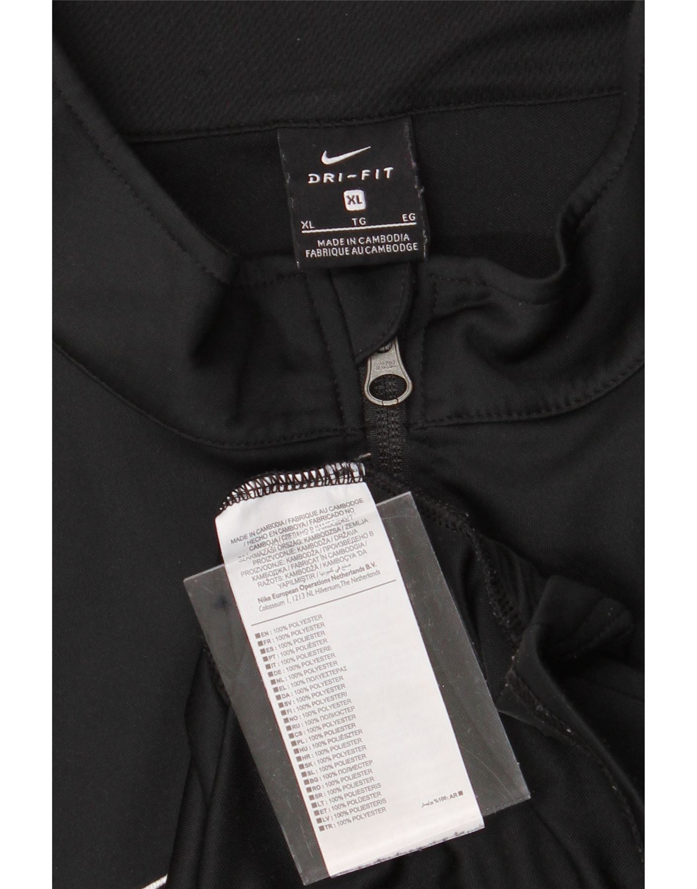 - AI Description: Elevate your sportswear with this pre-owned Nike jacket. Crafted from 100% polyester fleece, this black, regular fit jacket features a collared neckline and long sleeves. The full zip closure and zipped pockets offer practicality. Accented with the iconic Nike logo, this size XL jacket is ideal for a sporty style. This jacket is in excellent condition and originates from Cambodia. A perfect blend of comfort and style.