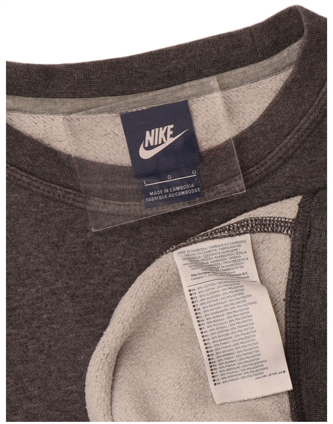 - AI Description: This Nike men's sweatshirt jumper is crafted from a comfortable grey cotton blend. The blended fabric offers a soft feel, enhanced by a cosy fleece lining. It features a classic round neck and long sleeves, ensuring warmth and coverage. The regular fit provides ease of movement, while the pullover style keeps it simple. A prominent graphic and logo accent add a signature Nike touch.