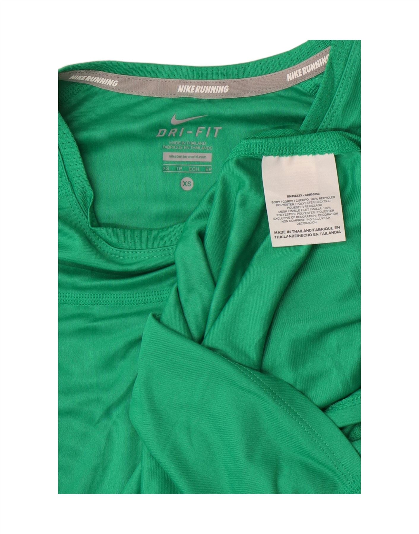 - AI Description: This Nike women’s T-shirt top is made from breathable green polyester jersey. It features a round neck and short sleeves for a classic sports style. The slim fit provides a streamlined silhouette with added stretch. A logo accent and reflective detailing enhance visibility. Lightweight and perfect for performance, it's made in Thailand.