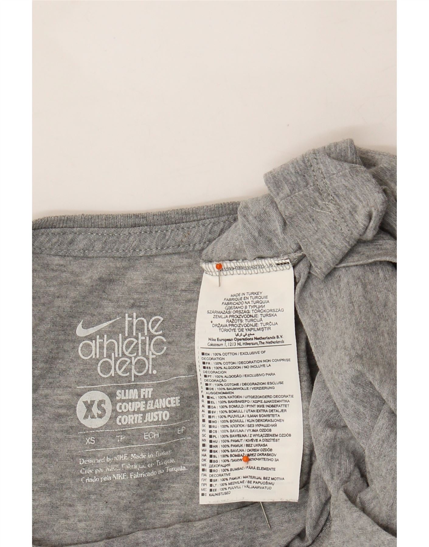 - AI Description: This pre-owned Nike T-shirt is a stylish addition to your sportswear collection. Made from 100% cotton jersey, this slim-fit, grey top features a classic round neck and short sleeves. The pullover closure ensures easy wear, while the prominent logo adds a touch of brand recognition. In excellent condition, this size XS T-shirt, manufactured in Turkey, is perfect for sports or casual wear.