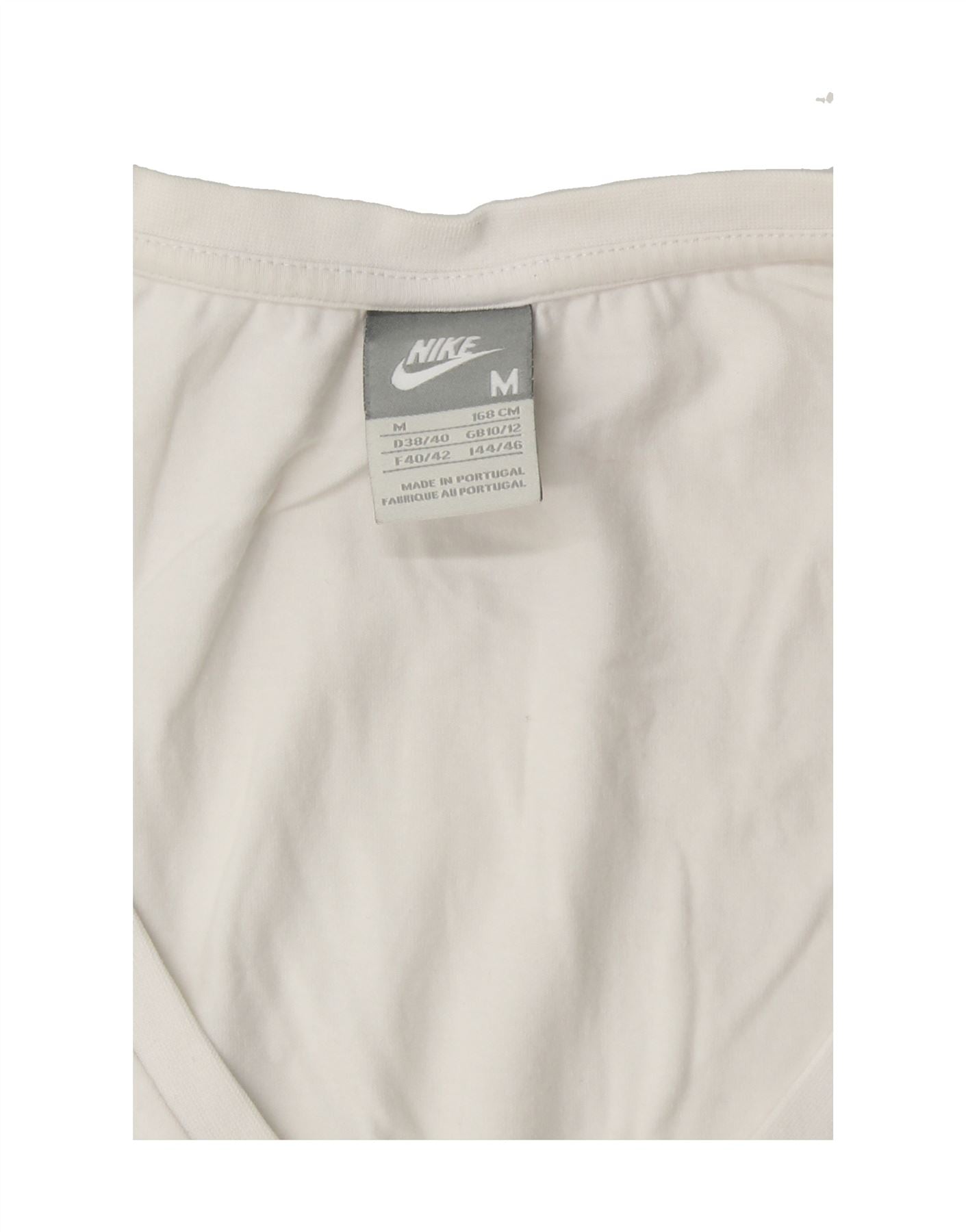 - AI Description: This pre-owned Nike T-shirt top is in excellent condition. The white, slim-fit knit top features a V-neck and short sleeves. The T-shirt has a graphic design and logo accent. A stylish sports top made in Portugal. Label size: M.