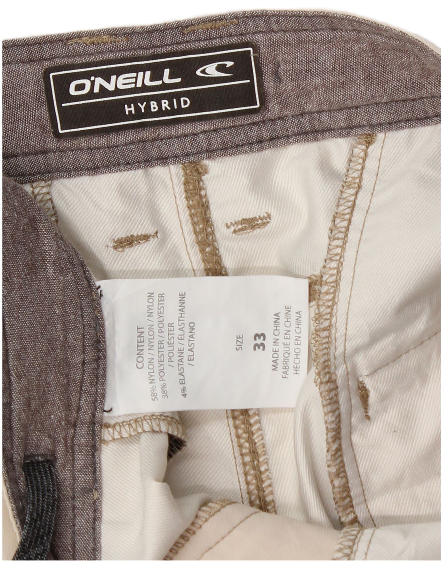 - AI beskrivelse: Disse ONeill hybridshorts til mænd er lavet af et beige blandet stof af nylon, polyester og elastan, der tilbyder stretch og komfort. De har en normal pasform og en justerbar talje med både knaplukning og snøre. Praktiske lommer er inkluderet, og en subtil logoaccent tilføjer mærkegenkendelse. Designet er ideelt til strandtøj.