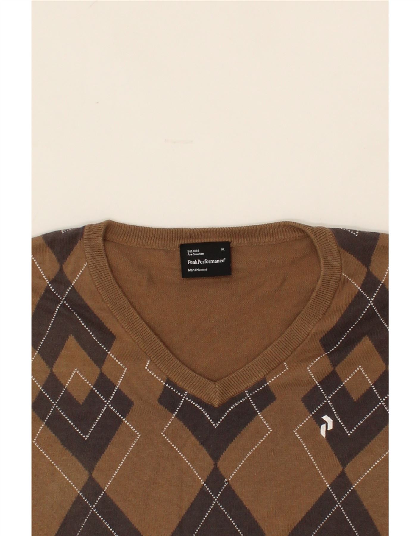PEAK PERFORMANCE Mens V-Neck Jumper Sweater XL Brown Argyle/Diamond Cotton