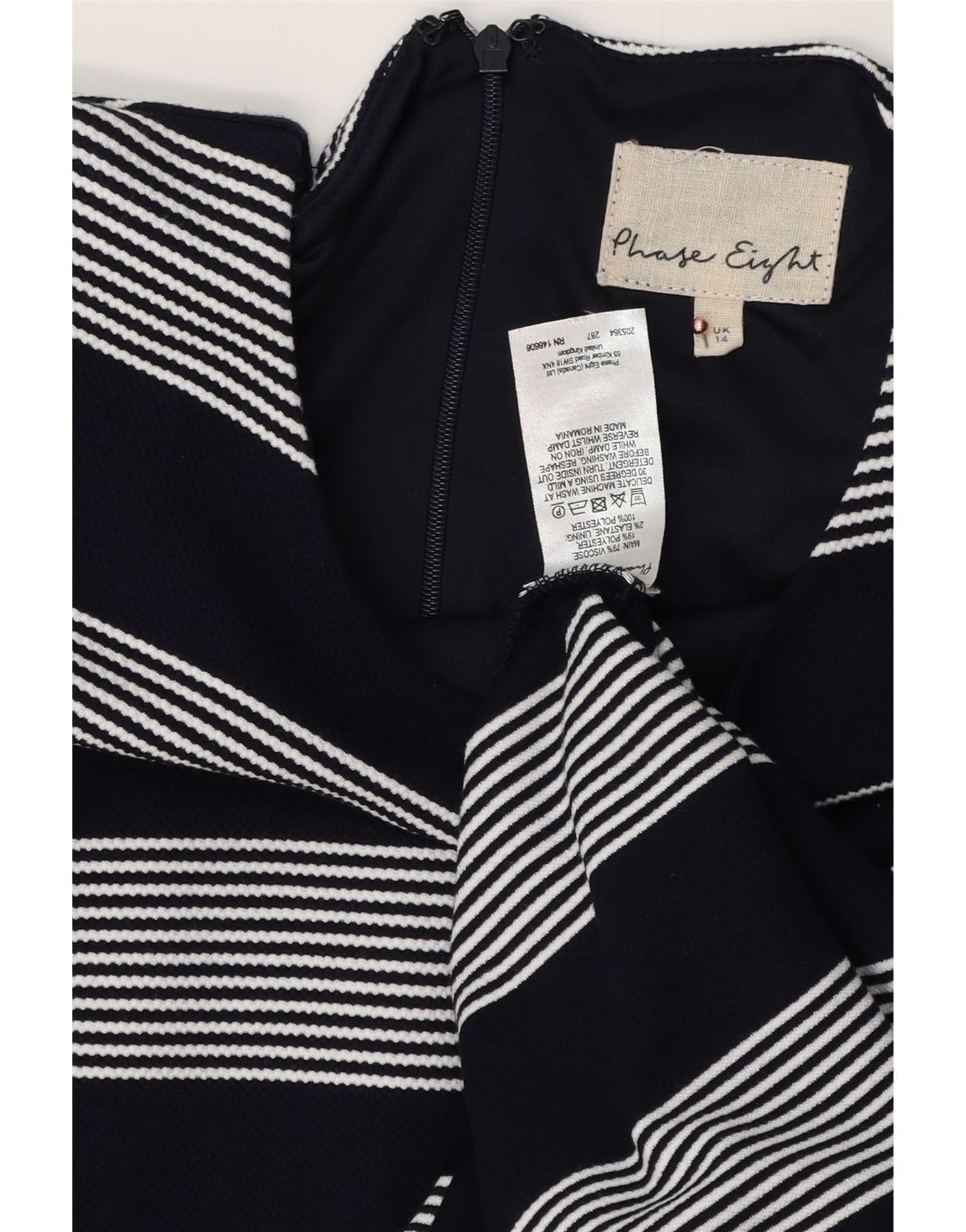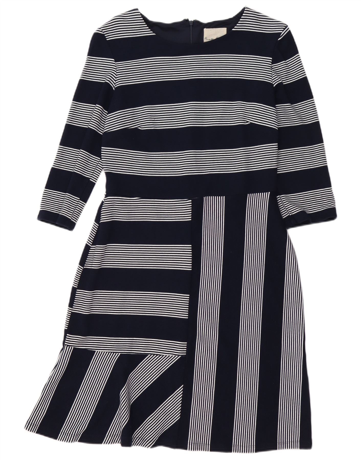- AI beskrivelse: Denne Phase Eight damekjole er lavet af et blødt viskoseblandingsstof i marineblå og hvide striber. Den har en klassisk rund halsudskæring og elegante 3/4 ærmer. Overdelen og den øverste nederdel viser vandrette striber. Den nederste nederdel går over til lodrette striber med en legende diagonal stribet flæsedetalje. En lynlåslukning bagpå sikrer en jævn, regelmæssig pasform. Dette design tilbyder en moderne, sofistikeret silhuet.