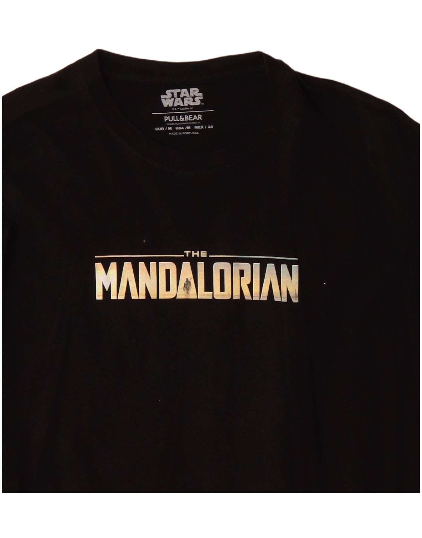 - AI beskrivelse: Denne Pull & Bear herre grafiske T-shirt Top er lavet af blødt sort jerseystof. Den har en klassisk rund hals og korte ærmer. Den almindelige pasform sikrer behageligt slid. Forsiden viser The Mandalorian-logo i en slående guldtone. Bagsiden viser en levende illustration af The Mandalorian-karakter. Et lille Star Wars-logo er synligt på kanten. Dette pullover-design tilbyder et stilfuldt, afslappet look til fans.