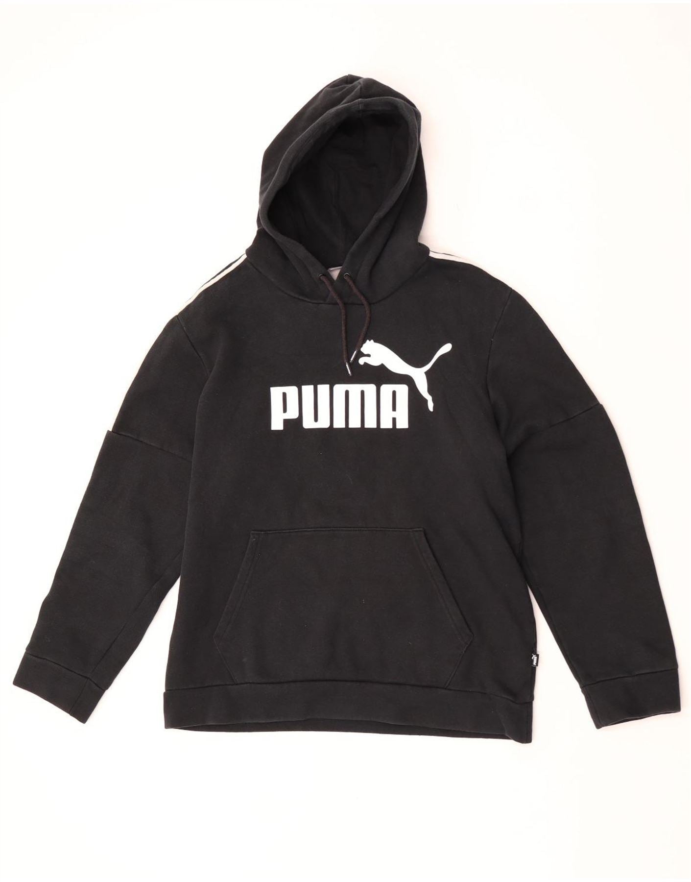 - AI beskrivelse: Denne Puma hættetrøje til mænd er præsenteret i klassisk sort jerseystof. Den har et behageligt hættedesign og lange ærmer med manchetter. Pulloveren giver en normal pasform. En fremtrædende hvid Puma-logo-grafik pryder brystet. Mærketapedetaljer løber langs skuldrene og ærmerne. En praktisk kængurulomme foran fuldender designet.
