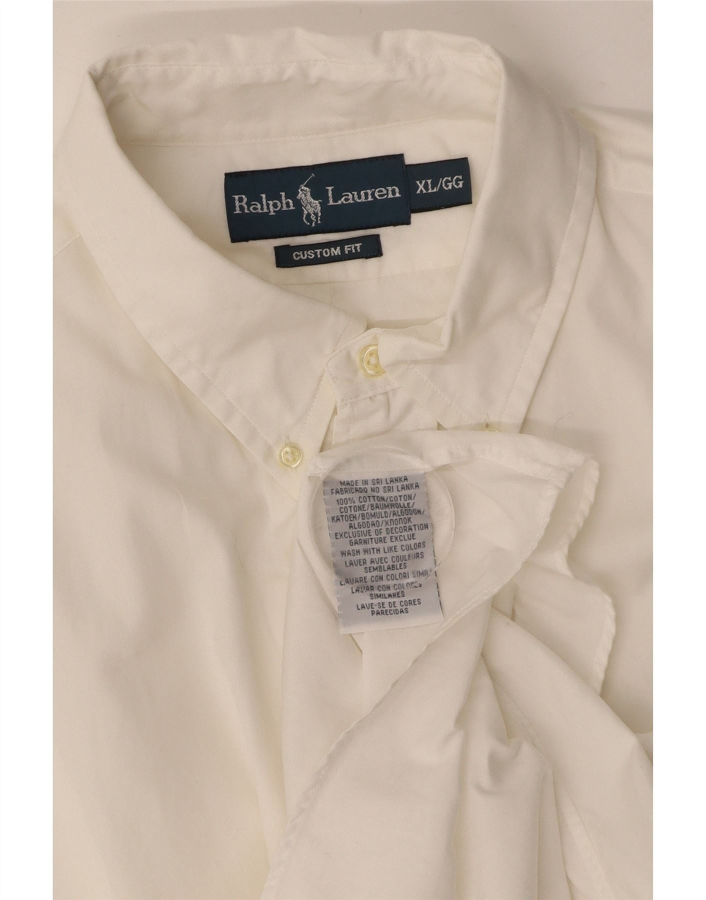 - AI Description: This Ralph Lauren mens shirt is crafted from 100 percent woven cotton. Its off white fabric offers a clean, crisp texture. It features a classic collared neckline and a button up front. Short sleeves complete the design. The custom fit provides a tailored yet comfortable silhouette. A subtle logo accent adds a signature touch. This classic style ensures timeless appeal.