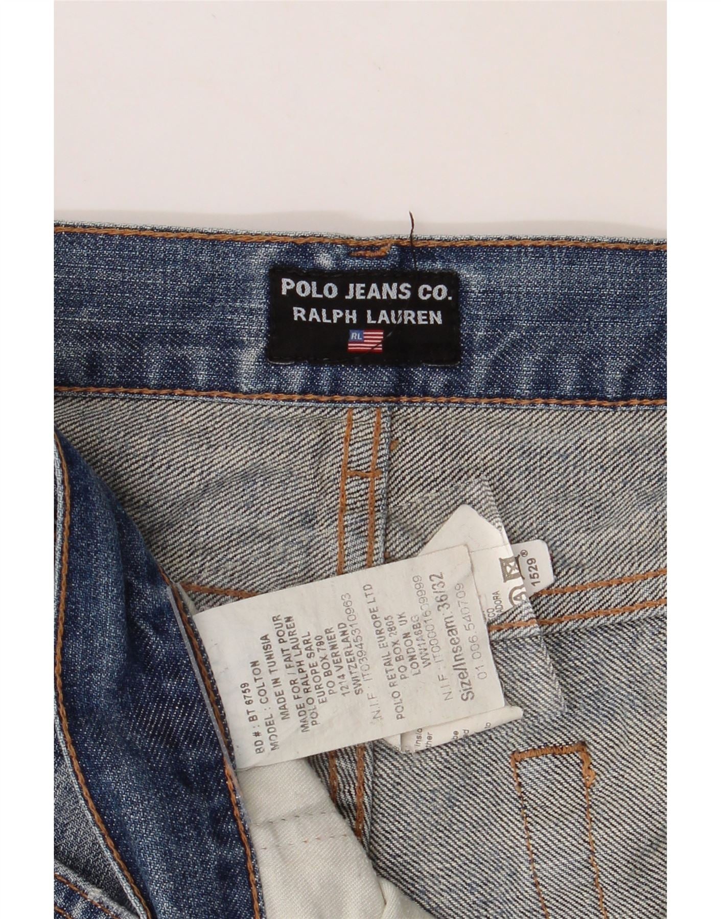 - AI Description: Polo Ralph Lauren men's jeans in pre-owned excellent condition. These classic, regular fit jeans are crafted from blue denim with a button closure. Featuring a regular fit, they offer practicality with pockets and a button accent. Size 36/32. Minor visible wear includes fraying on the hem. Made in Tunisia. RRP £25.
