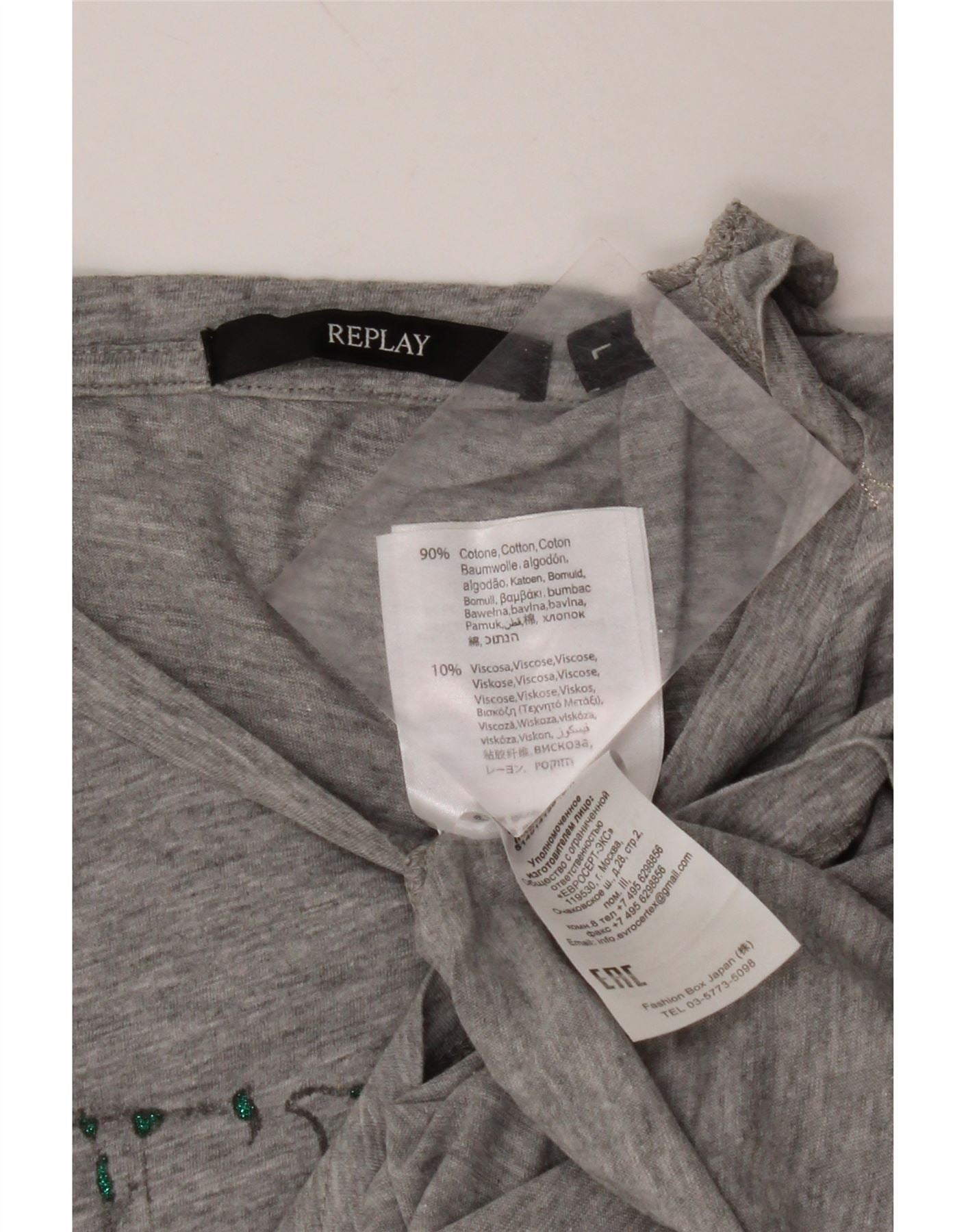 REPLAY Dame Grafisk T-Shirt Top UK 16 Stor Grå Bomuld