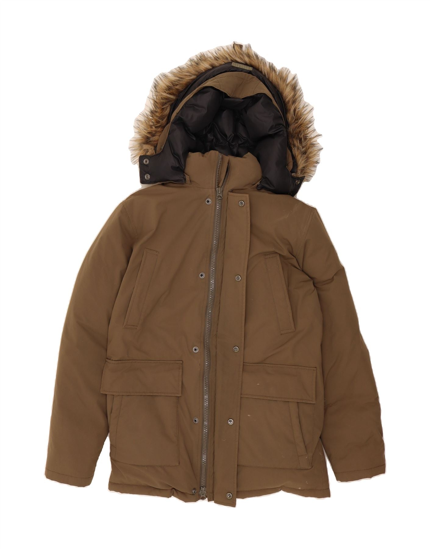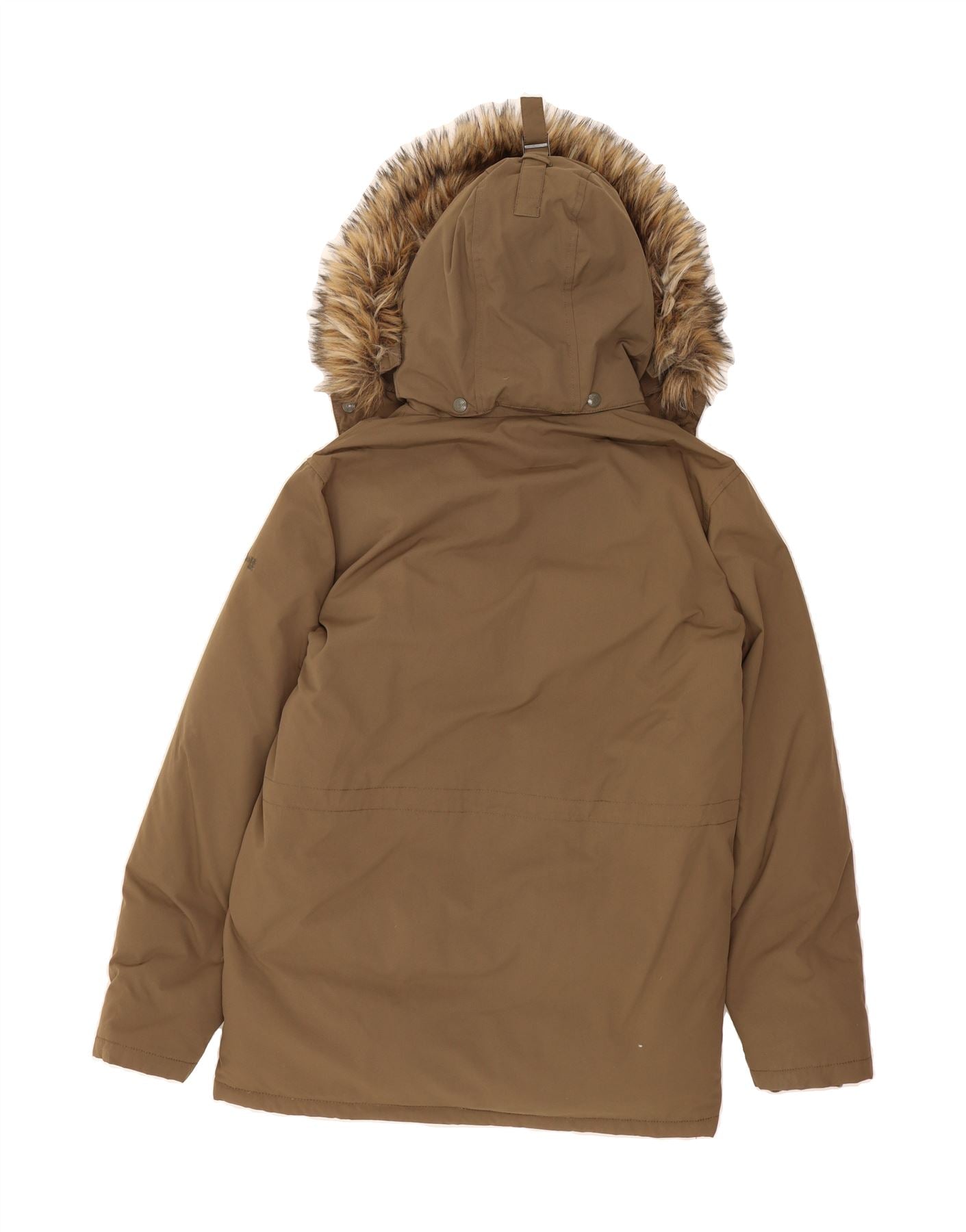 - AI Description: This pre-owned Schott padded jacket is perfect for winter. Constructed from durable polyester with a down fabric type, it features a regular fit, zip closure, and a practical hood with fur trim. The brown jacket includes zipped pockets for added convenience and is water-resistant. While in fair condition, it exhibits minor stains on the front, pocket, and back. Size M.