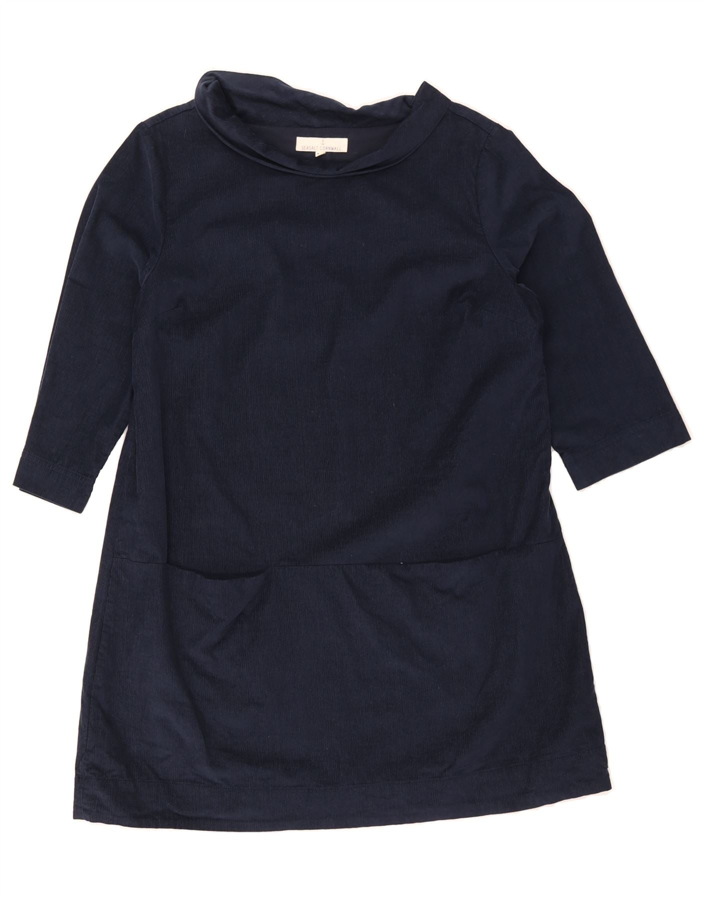- AI Description: Seasalt Cornwall classic top in navy blue corduroy. This pre-owned top features 3/4 sleeves, a round neck, and a regular fit. It's a size 14. Design details include practical pockets and a pullover closure. Garment has minor visible wear on the collar and back, including slight discolouration on the collar. Washing instructions: Do not bleach, tumble dry or dry clean. Warm iron on reverse, wash dark colours separately and save energy by washing at a lower temperature.