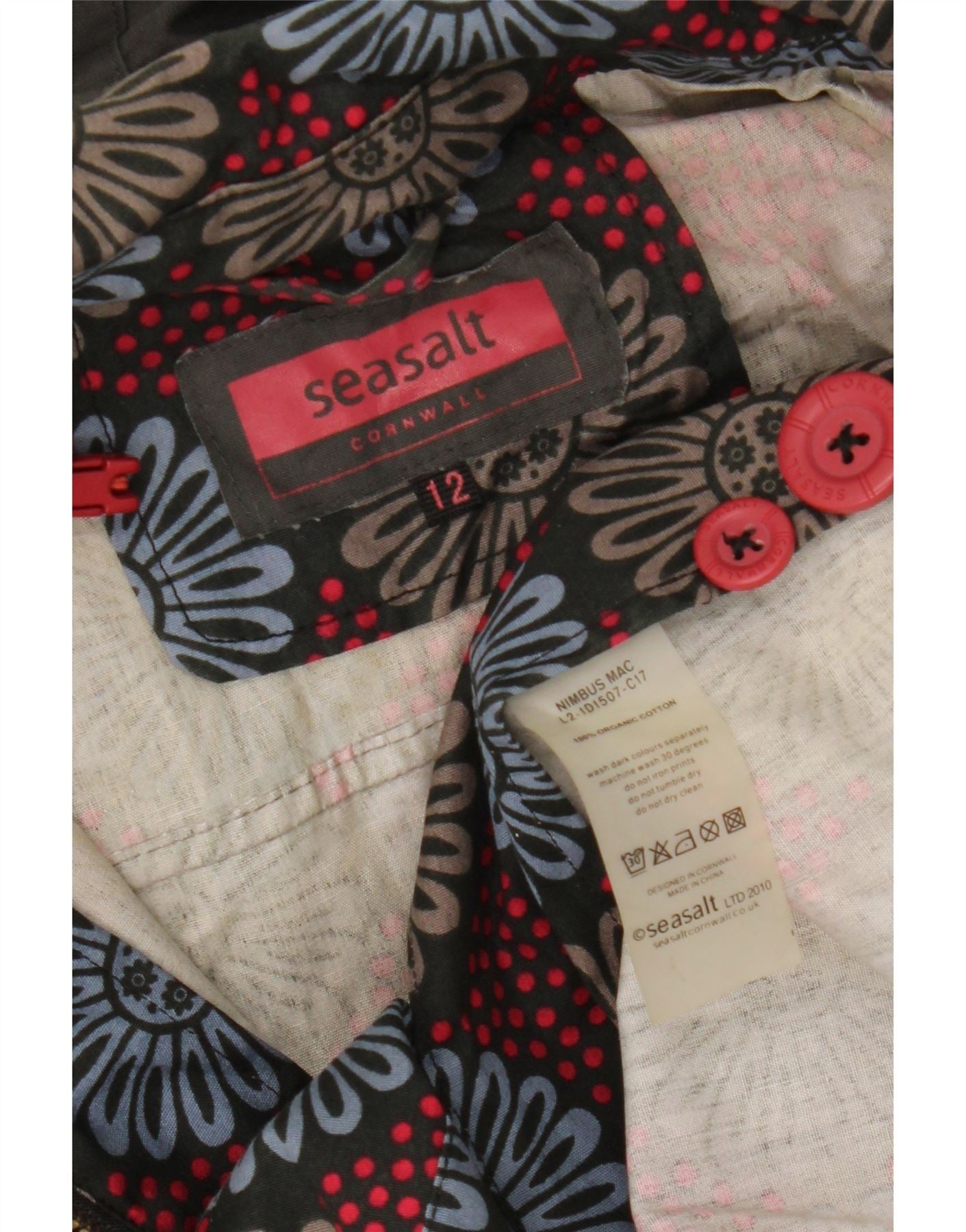 - AI Description: This Seasalt Cornwall womens raincoat is crafted from 100 Organic Cotton, offering a durable yet soft feel. Its multicoloured floral pattern adds a vibrant, retro touch. The design features a practical hood and a high neck for added protection. Long sleeves and a button closure complete the classic silhouette. With a regular fit and functional pockets, this waterproof mac combines style with everyday utility.
