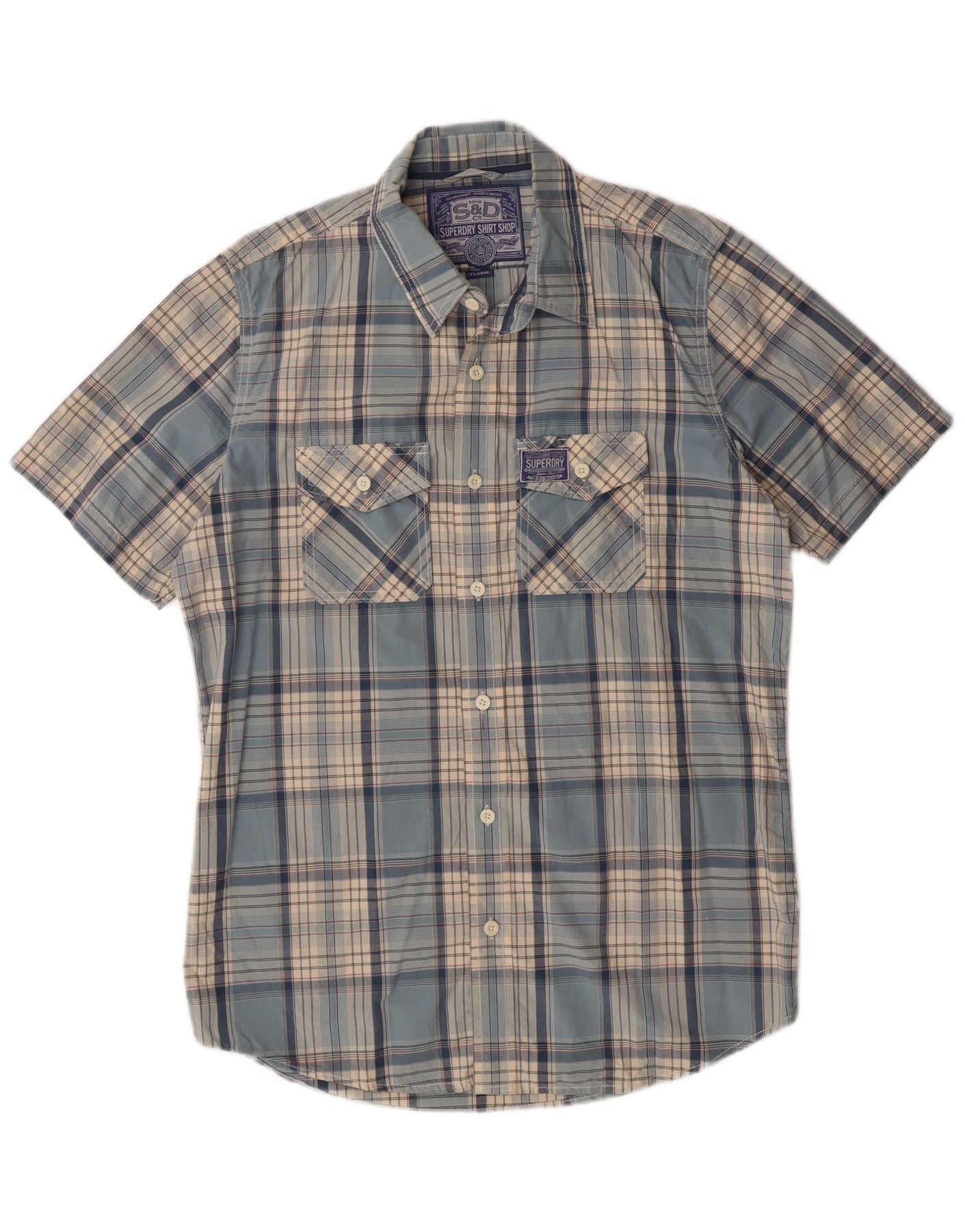 SUPERDRY kortærmet herreskjorte XL blå ternet bomuld