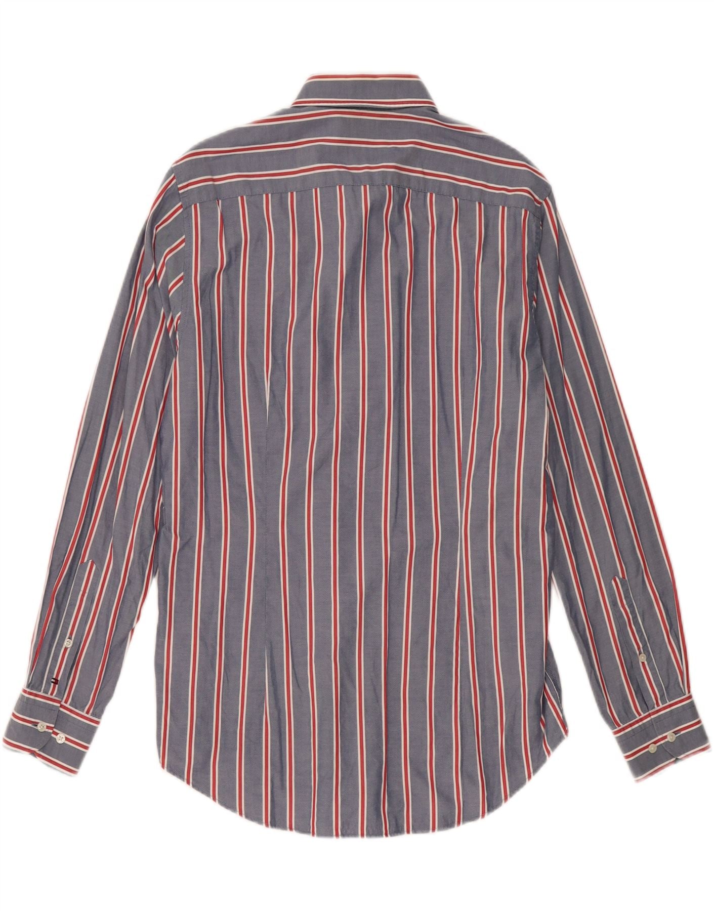 - AI Description: This Tommy Hilfiger mens shirt is crafted from 100 percent woven cotton, offering a crisp, comfortable feel. It features a classic collared neckline and a full button-up front for a refined look. The blue striped pattern adds a timeless visual appeal. Long sleeves with buttoned cuffs complete the design. Its slim, fitted cut provides a modern, tailored silhouette, perfect for smart casual wear.