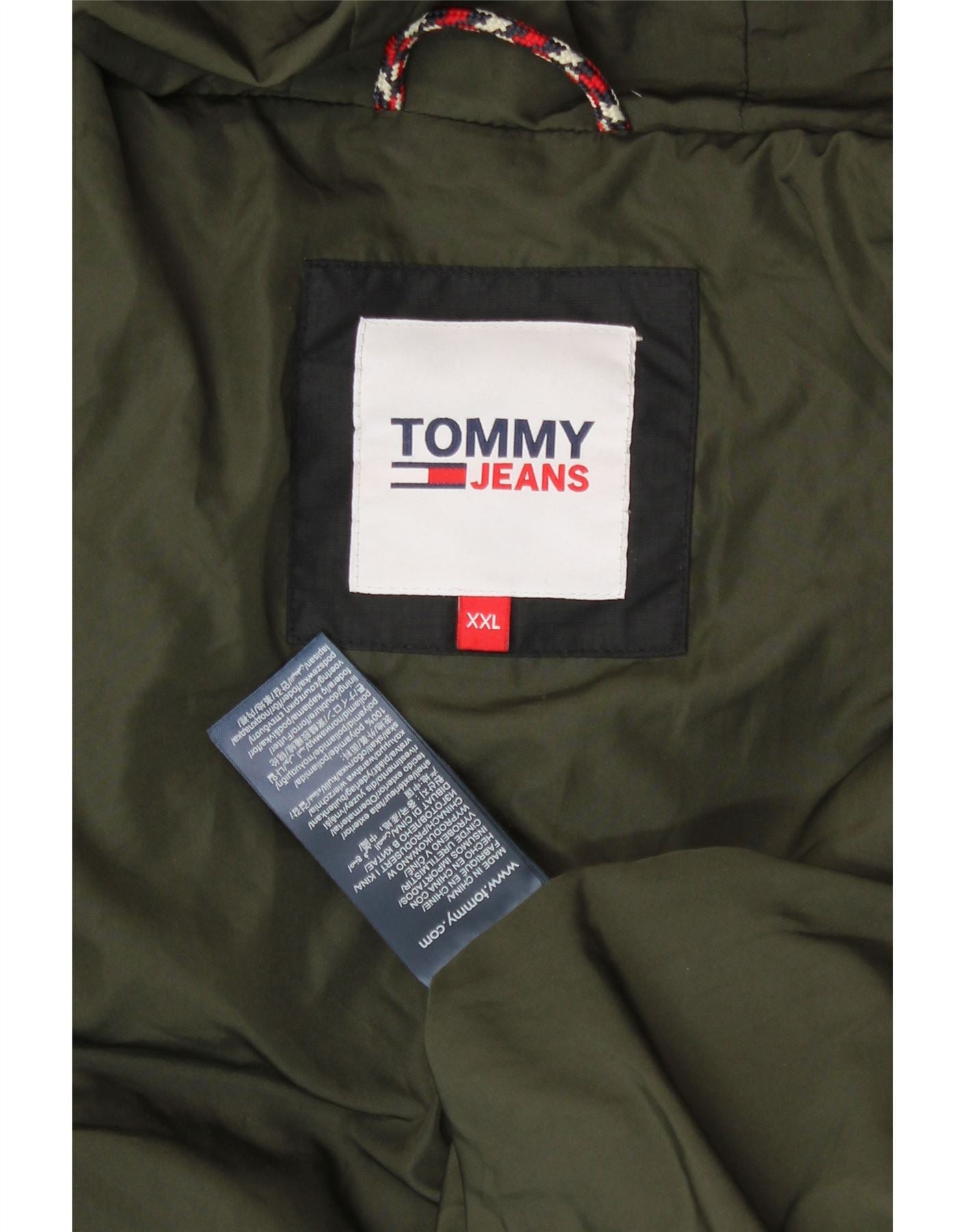 - AI Description: Tommy Jeans men's padded jacket in black. This modern, regular fit jacket features a secure zip closure, a practical hood, and useful pockets. The down fabric provides excellent insulation. Accented with the iconic Tommy Jeans logo. Brand new with tags. Label size XXL.