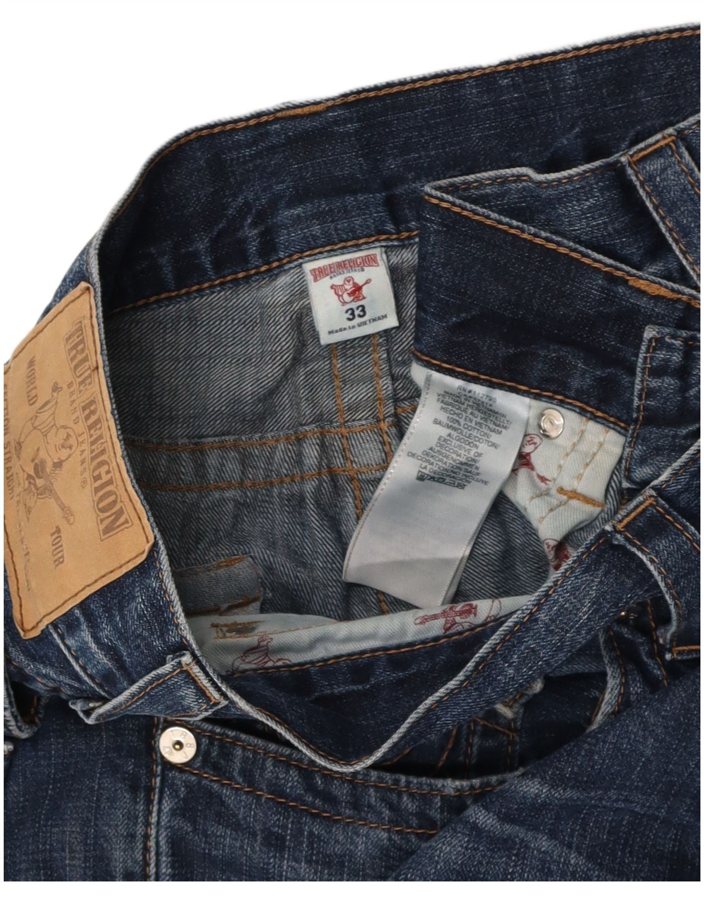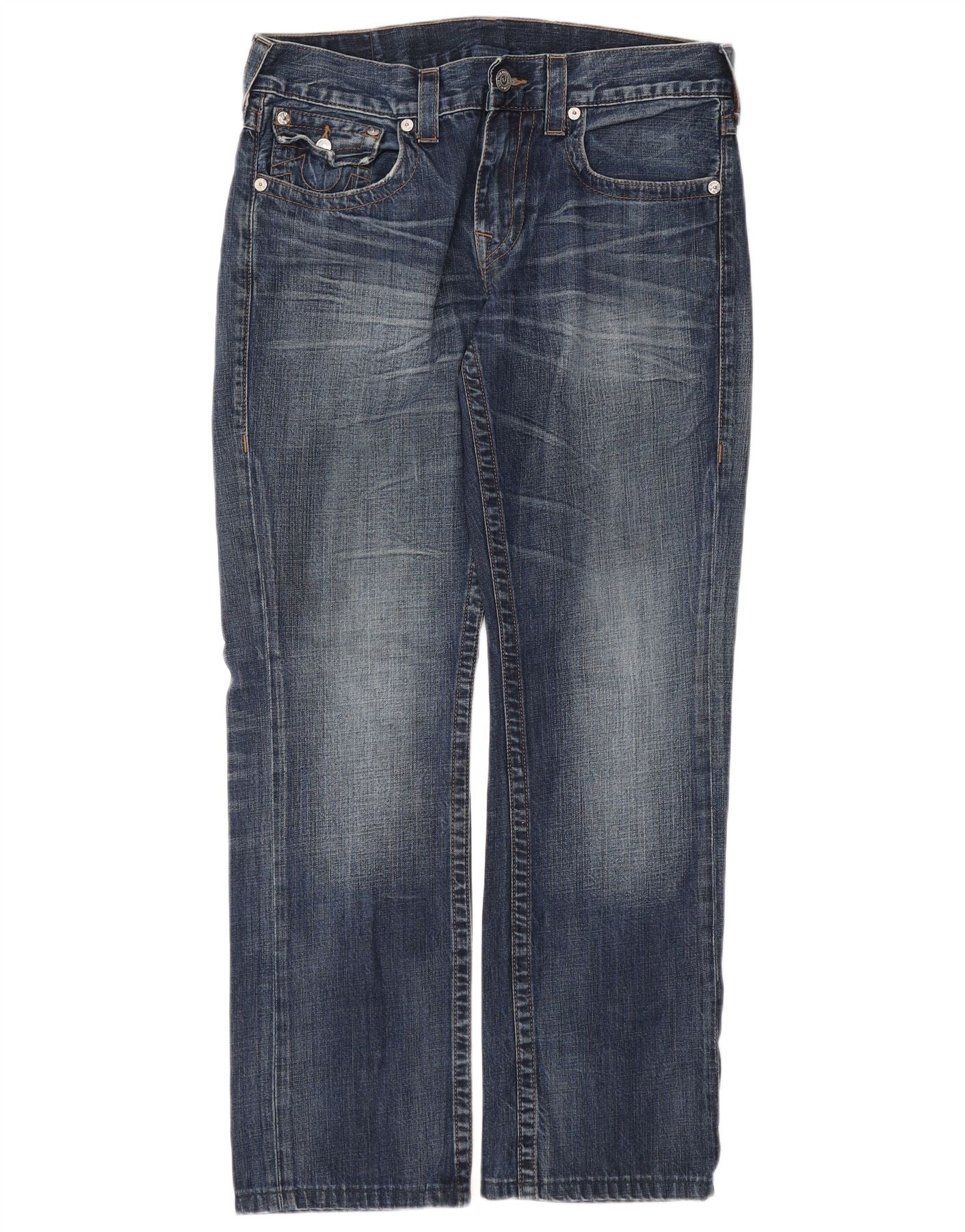 - AI Description: These True Religion mens straight jeans are crafted from robust blue denim, made from 100 percent cotton. They feature a classic straight leg and a regular fit for comfort. The button closure ensures a secure fastening. Subtle distressed detailing adds a contemporary edge. Practical pockets are included, and a signature logo accent completes the design, offering a timeless yet modern aesthetic.