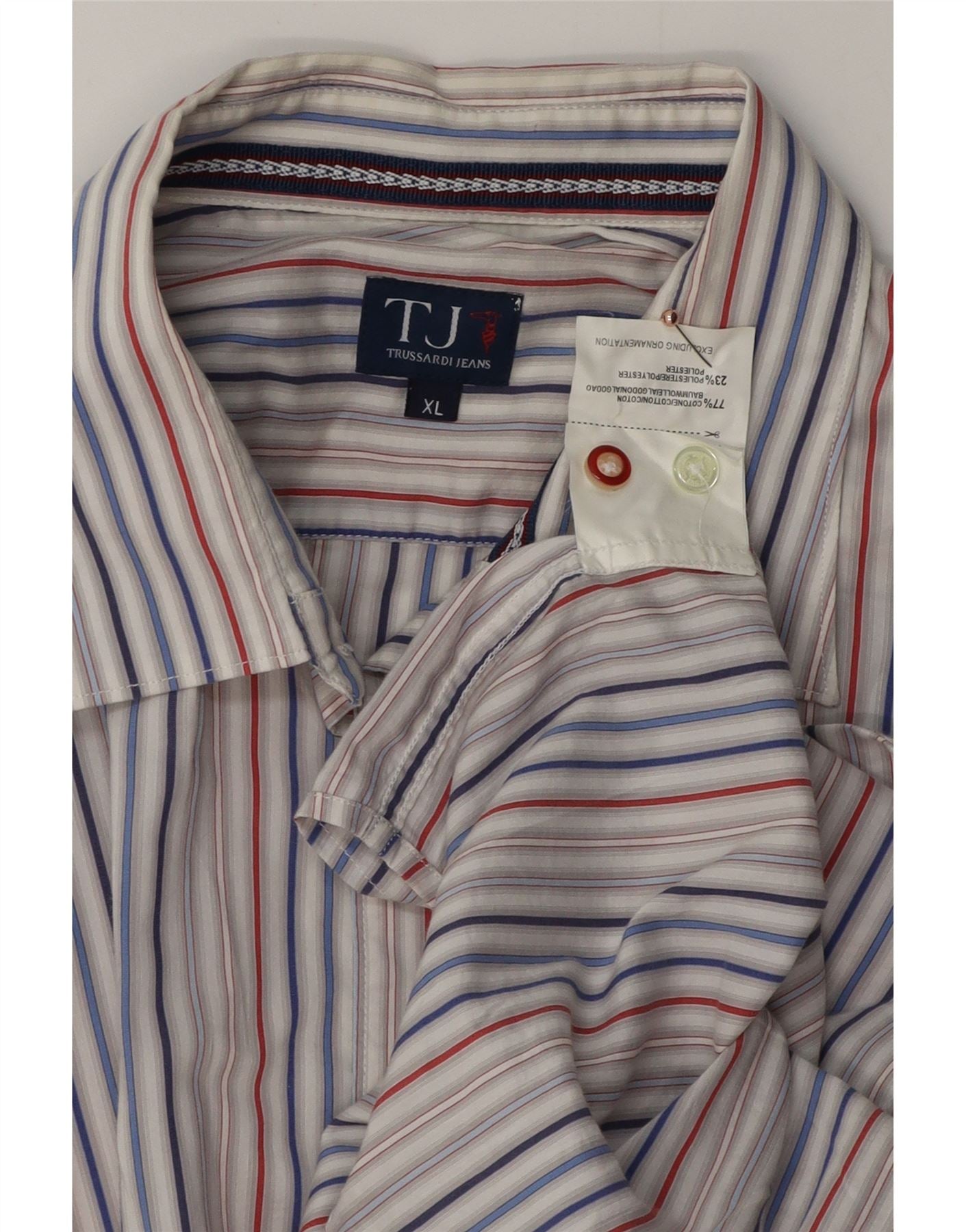 - AI beskrivelse: Denne Trussardi Jeans herreskjorte er lavet af et behageligt bomuldsblandingsstof. Den har en klassisk halsudskæring og en fuld knap foran. Det flerfarvede stribede mønster i rød, blå og grå giver en smart, afslappet æstetik. Lange ærmer med manchetter med knapper fuldender designet. Dens regelmæssige pasform sikrer en behagelig og alsidig silhuet.