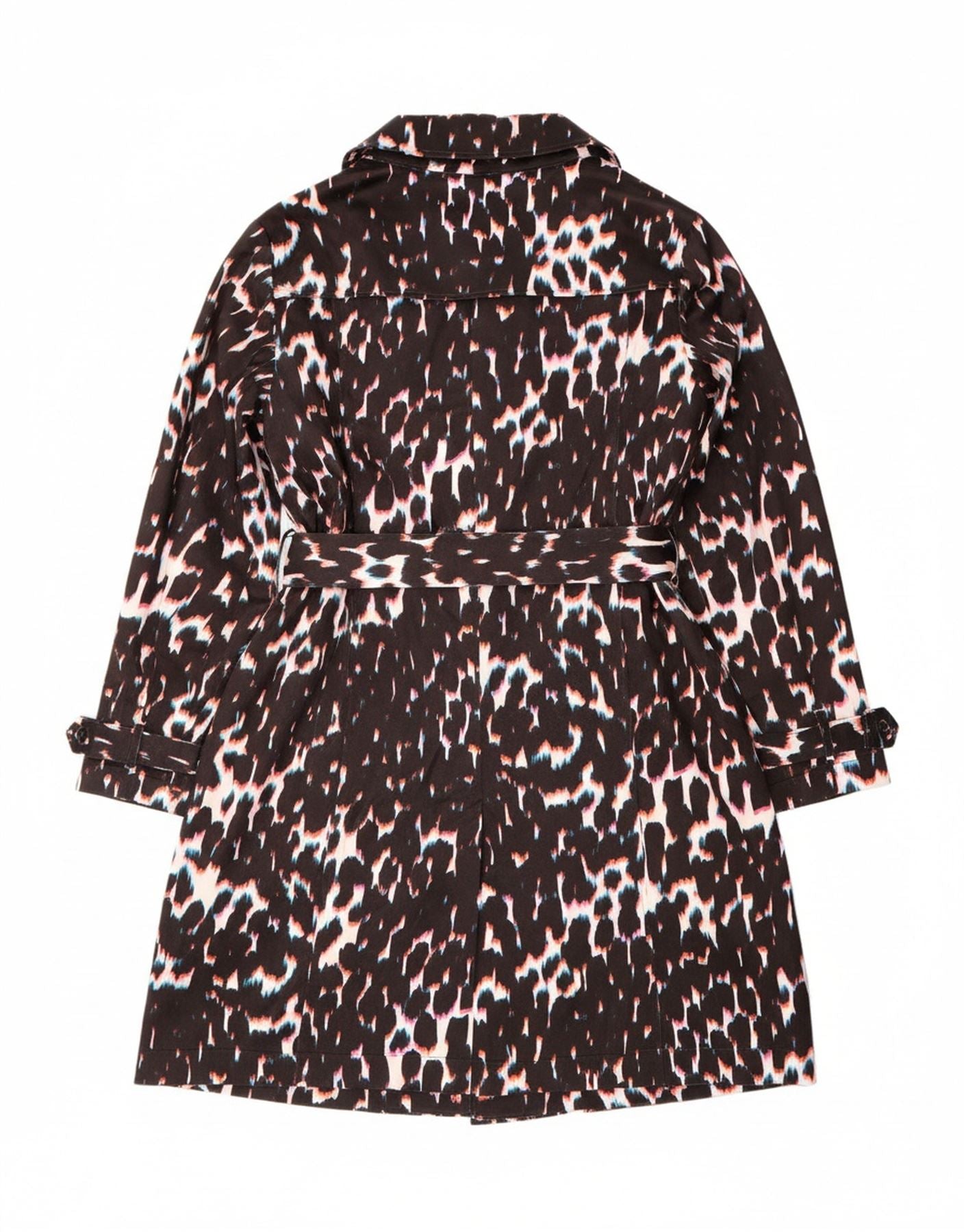 - AI Description: This Vintage womens trench coat is crafted from 100 percent polyester with a woven texture. It features a sophisticated collared neckline and long sleeves, ideal for cooler weather. The double-breasted front fastens securely with buttons, offering a classic silhouette. An eye-catching animal print adds a bold, distinctive touch. A belted waist allows for a defined shape, while functional pockets provide practicality. This regular fit coat combines modern style with timeless appeal.