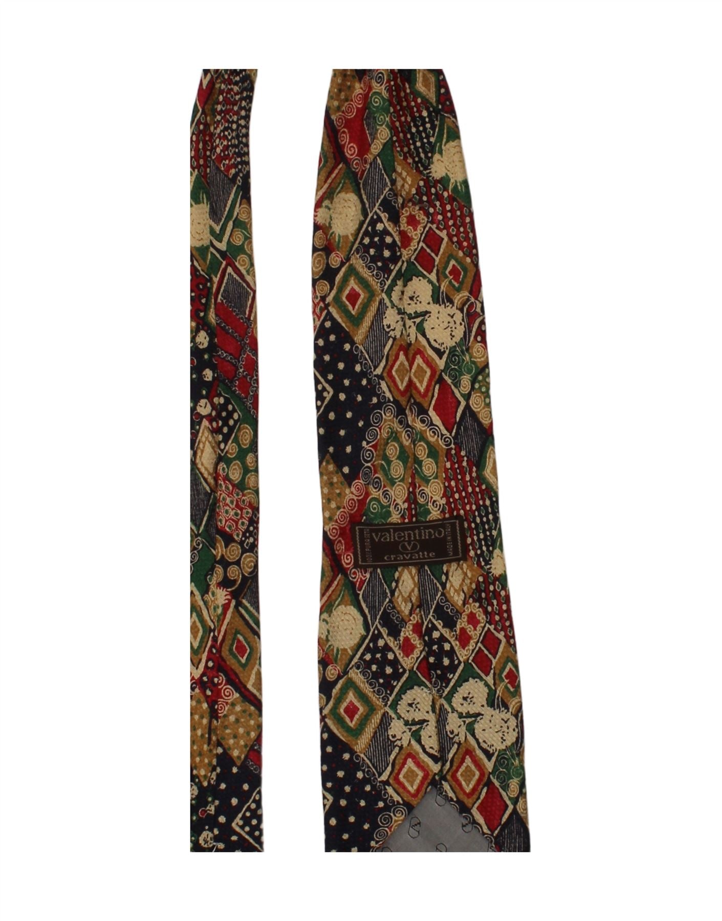 - AI Description: This Valentino mens tie is crafted from a finely woven fabric. It features a striking multicoloured geometric pattern, blending red, green, and navy blue hues. The classic fit ensures a timeless, elegant drape. Its structured design offers a refined finish. This accessory adds a sophisticated graphic touch to any formal ensemble.