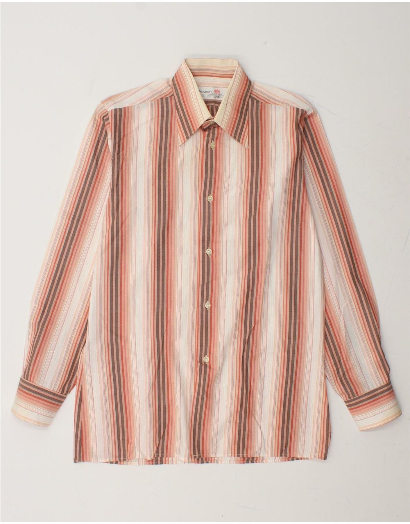 - AI Description: This Van Heusen mens shirt is crafted from a woven fabric. It features a classic striped pattern in multicoloured tones, including off white, orange, and brown. The collared neckline and button closure offer a timeless appeal. Long sleeves finish with cuffed detailing. A regular fit ensures comfortable wear. Practical pockets complete the design.