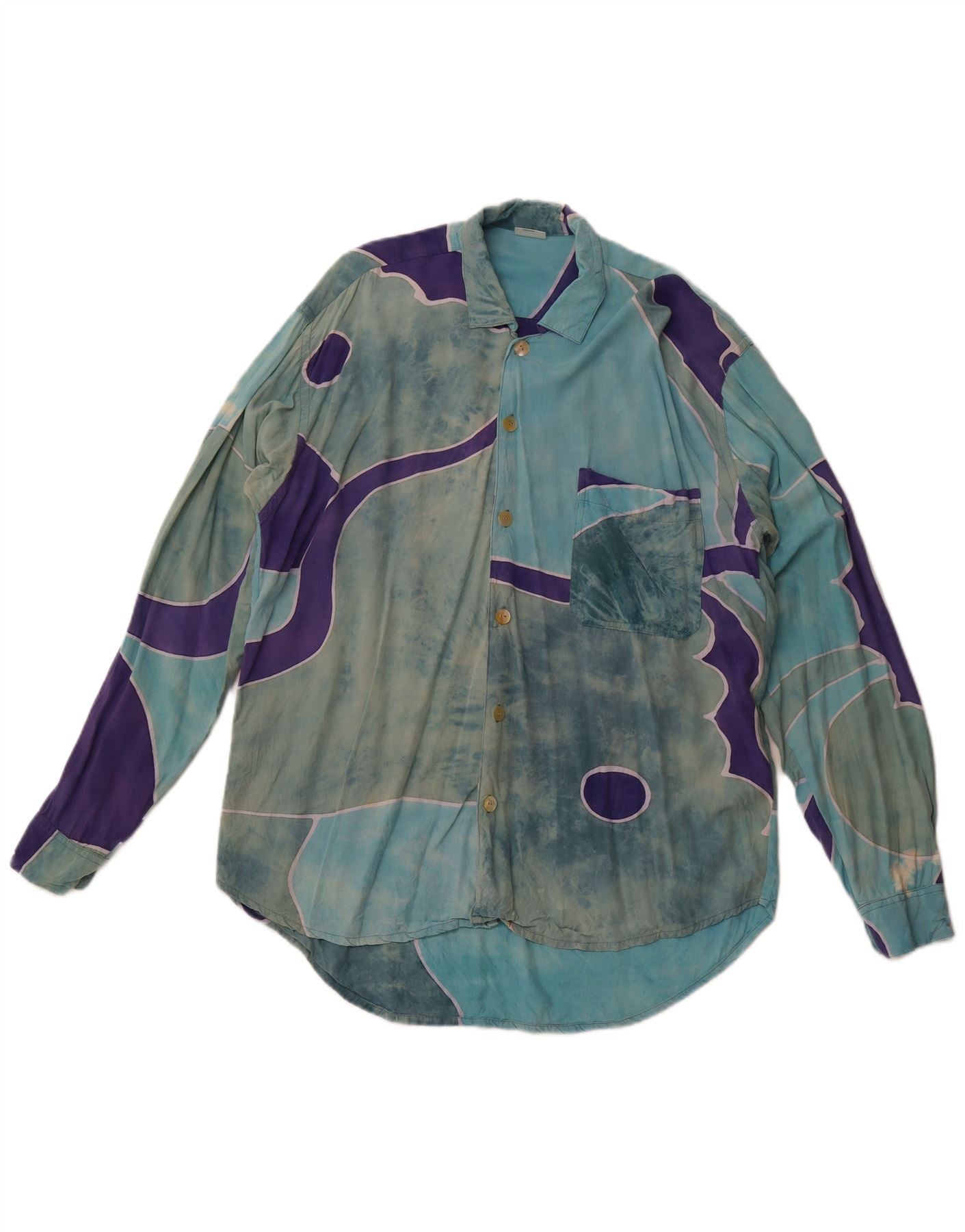 VINTAGE abstrakt mønsterskjorte til mænd XL blå rayon