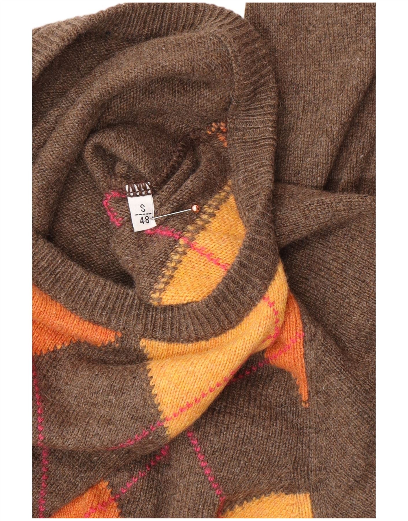 VINTAGE Herre Crew Neck Jumper Sweater IT 48 Small Brown Argyle/Diamond