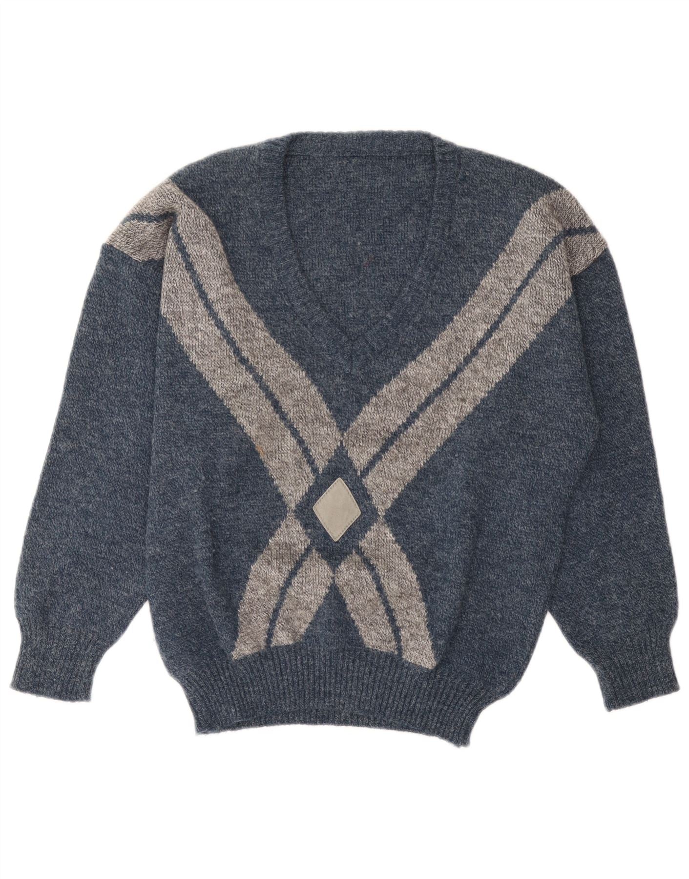 VINTAGE Herre V-hals sweater IT 52 Large Navy Blue Argyle/Diamond