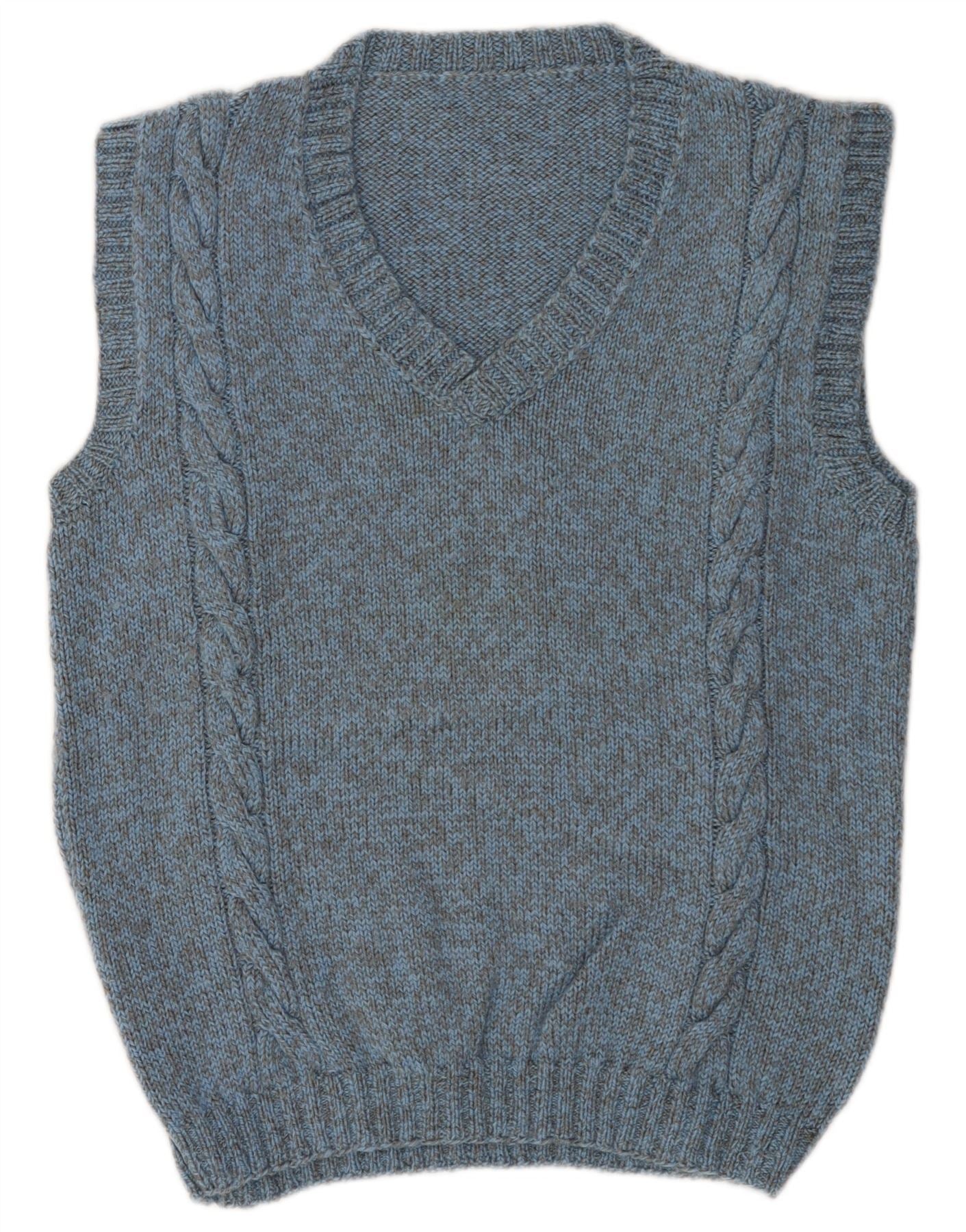 - AI beskrivelse: Denne vintage sweater med V-udskæring til mænd er lavet af et blåt mergelstrikket stof. Den har en klassisk V-udskæring og et ærmeløst design. Karakteristiske kabelstrikdetaljer løber ned ad hver side og tilføjer tekstur og visuel interesse. Den almindelige pasform sikrer behageligt slid. Ribkant forneden og ærmegabene fuldender dette tidløse, alsidige stykke, perfekt til lagdeling.