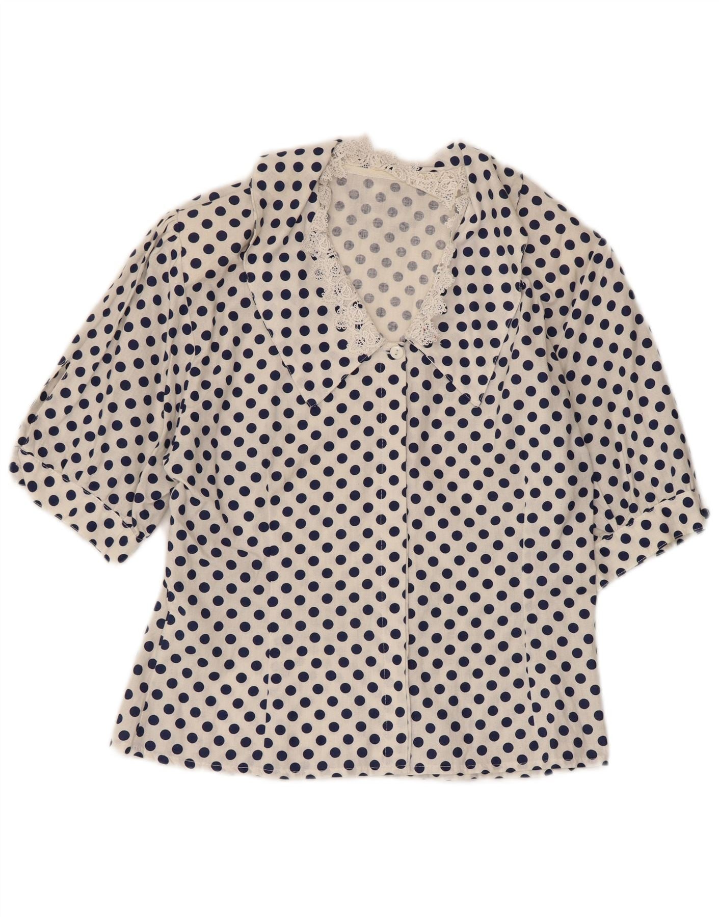 VINTAGE skjortebluse til kvinder med 1/2 ærmer UK 12 Medium White Polka Dot