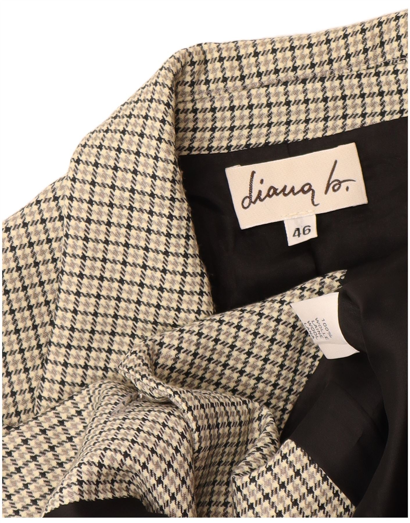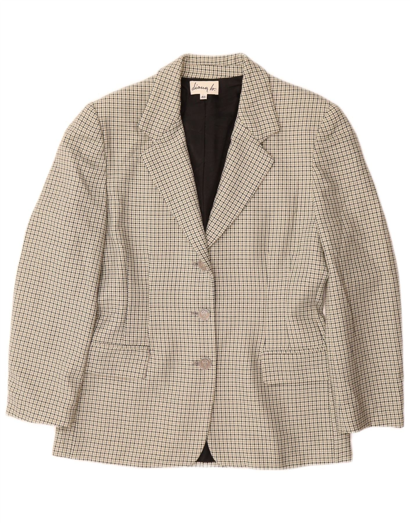 VINTAGE Dame 3-knaps blazerjakke IT 46 Large Grå Houndstooth Uld