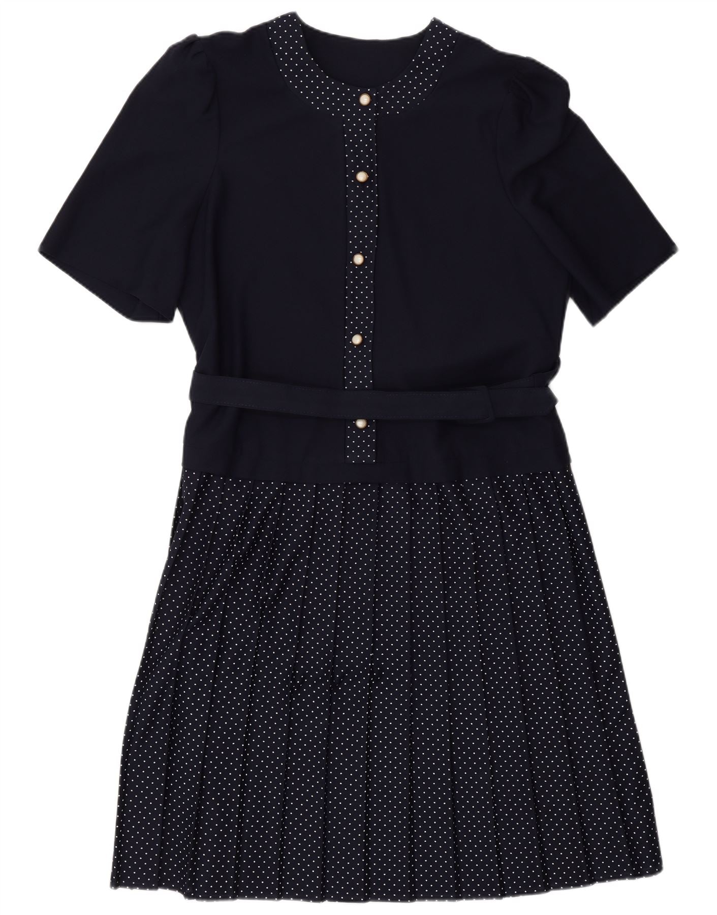VINTAGE A-line kjole til kvinder UK 16 Stor marineblå plettet polyester