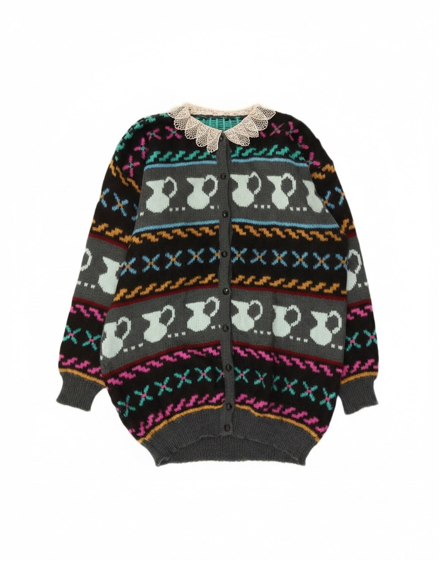 - AI beskrivelse: Denne vintage cardigan sweater til kvinder er lavet af et blødt, flerfarvet strikstof. Den har et abstrakt mønster af kander og geometriske motiver i levende nuancer mod en mørk baggrund. En delikat blondekrave tilføjer et charmerende retro-touch. Det langærmede design har en afslappet pasform, hvilket sikrer komfort. En fuld knaplukning foran giver klassisk stil. Dette stykke tilbyder en unik, hyggelig æstetik.