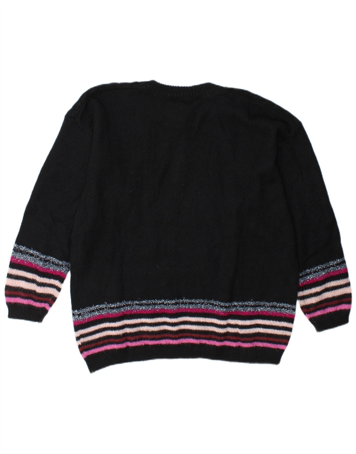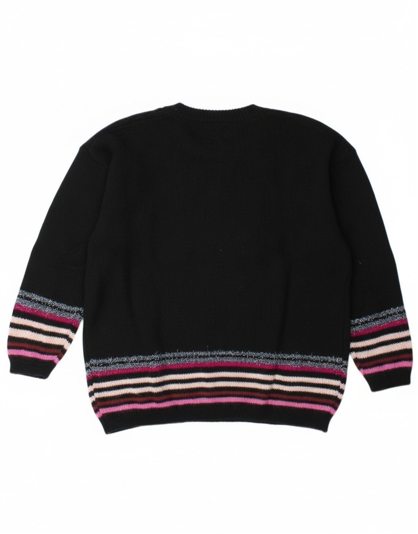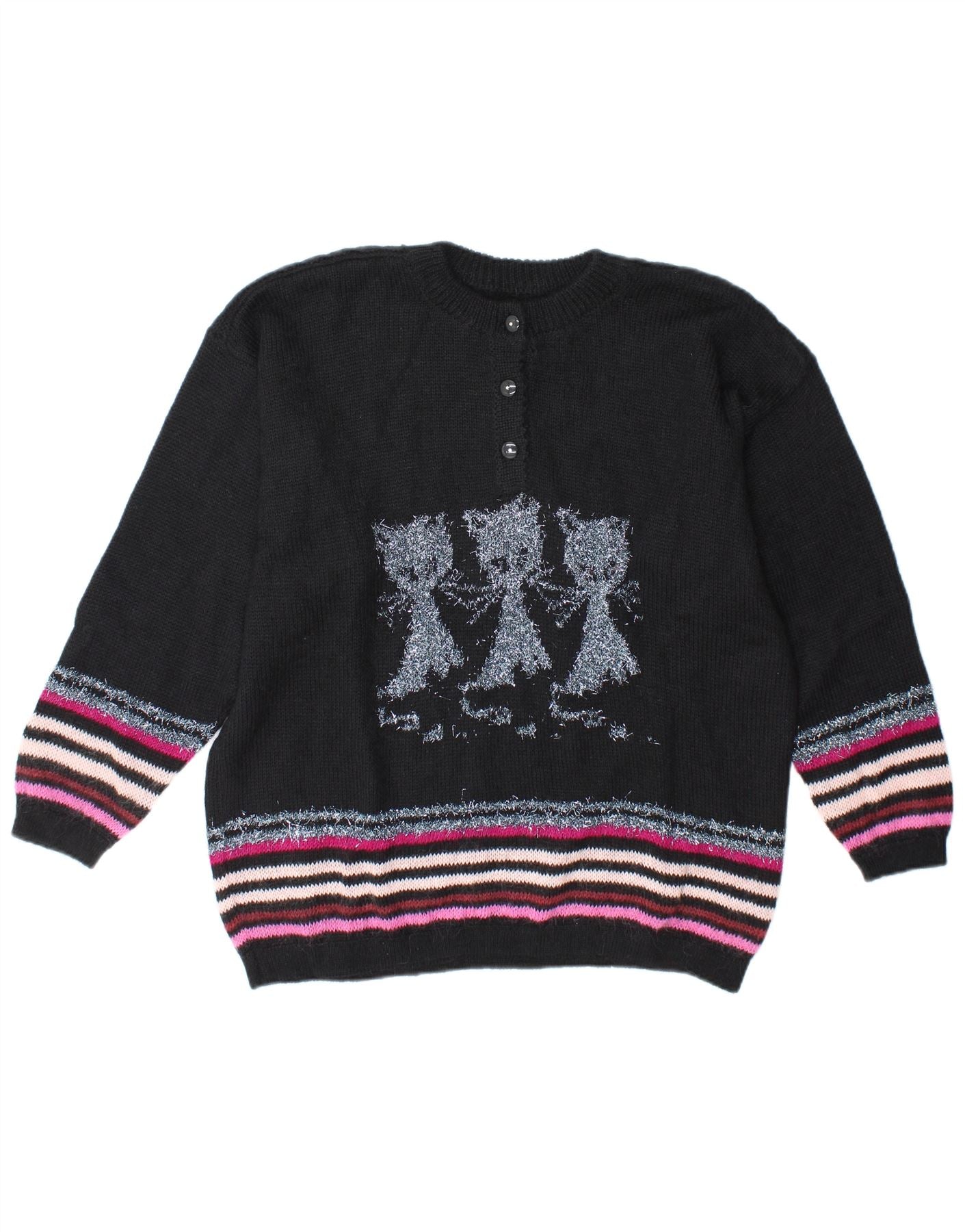 Vintage Kvinders Grafisk Button Neck Jumper Sweater UK 14 Stor Sort Stribet