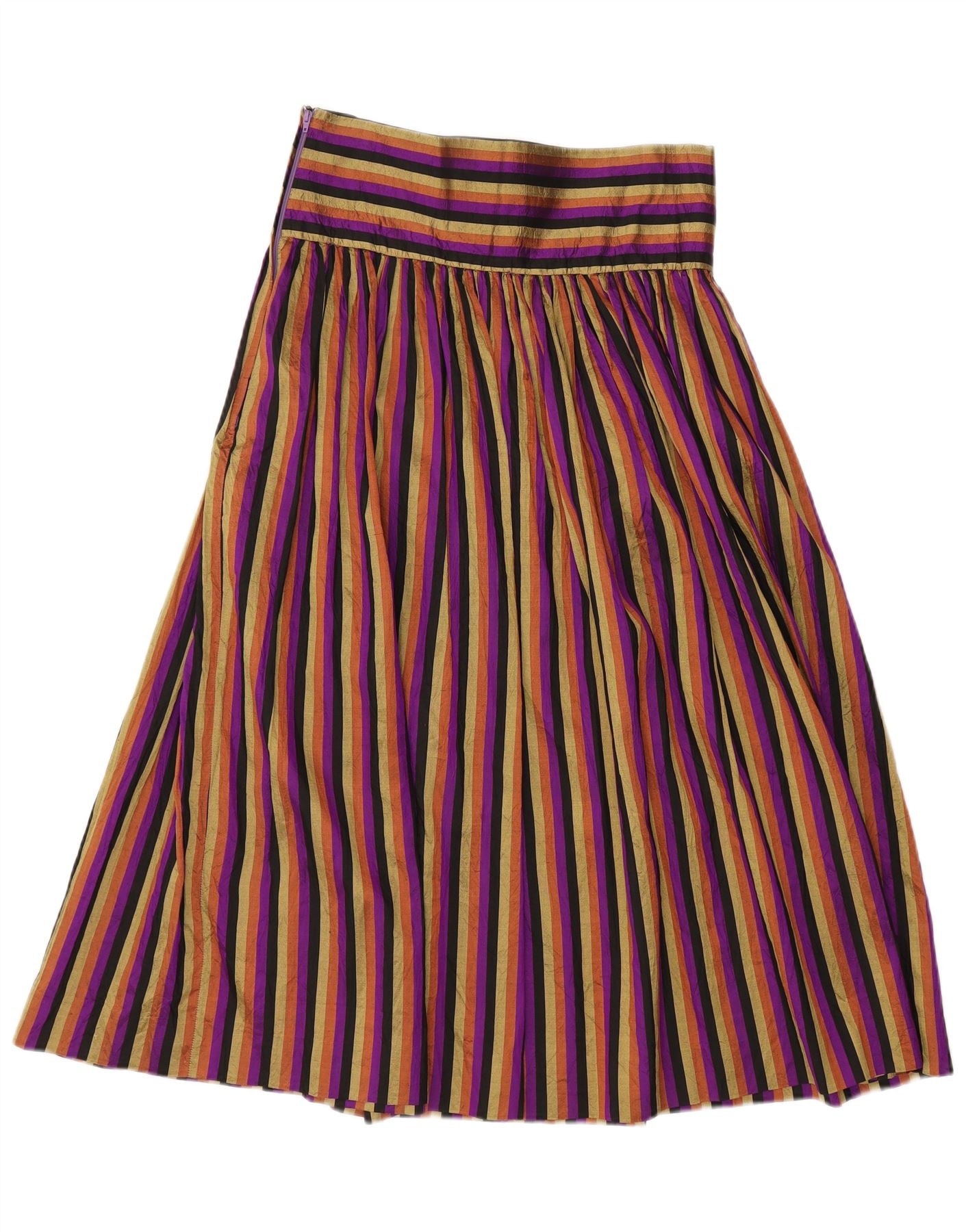 - AI beskrivelse: Denne vintage plisserede nederdel til kvinder er lavet af et vævet stof, der tilbyder en struktureret, men flydende drapering. Den har et levende stribet mønster i flerfarvede nuancer, inklusive lilla, orange og kaki. Nederdelen har et klassisk plisseret design, der skaber elegant bevægelse. Dens pull-on stil sikrer en glat, behagelig pasform. Den almindelige pasform og retrostil gør den til et alsidigt stykke til forskellige lejligheder.