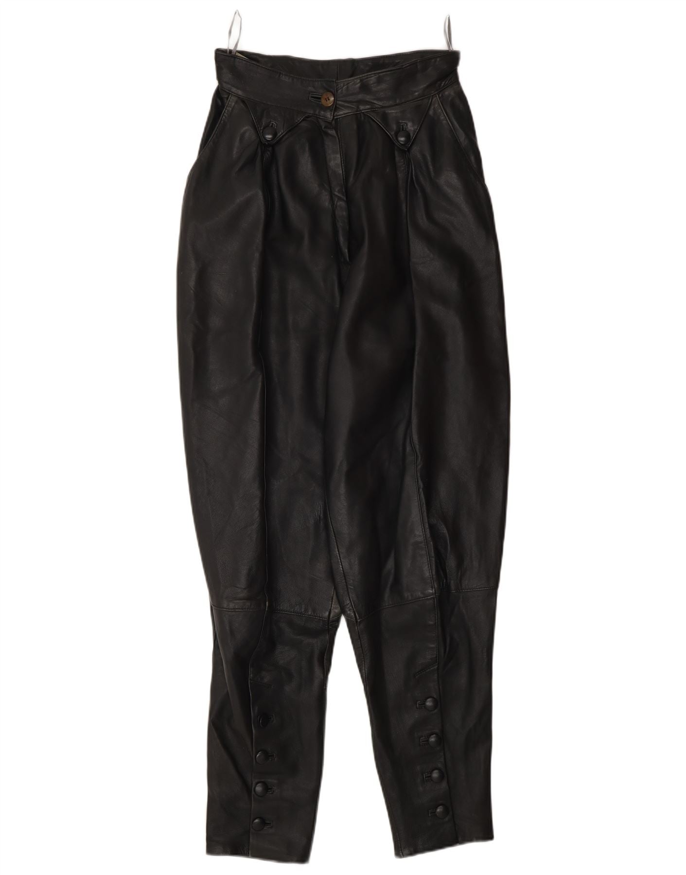 - AI beskrivelse: Disse vintage damebukser er fremstillet af luksuriøst ægte sort læder, der tilbyder en glat, smidig tekstur. De har en høj talje og en afslappet pasform, der repræsenterer en 80'er-stil. Designet indeholder praktiske lommer. En knaplukning sikrer fronten. Benene er tilspidsede og afsluttet med karakteristiske manchetter med knapper, der tilføjer unikke detaljer. Foret i 100 procent polyester sikrer komfort. Disse bukser blander vintage charme med moderne appel.
