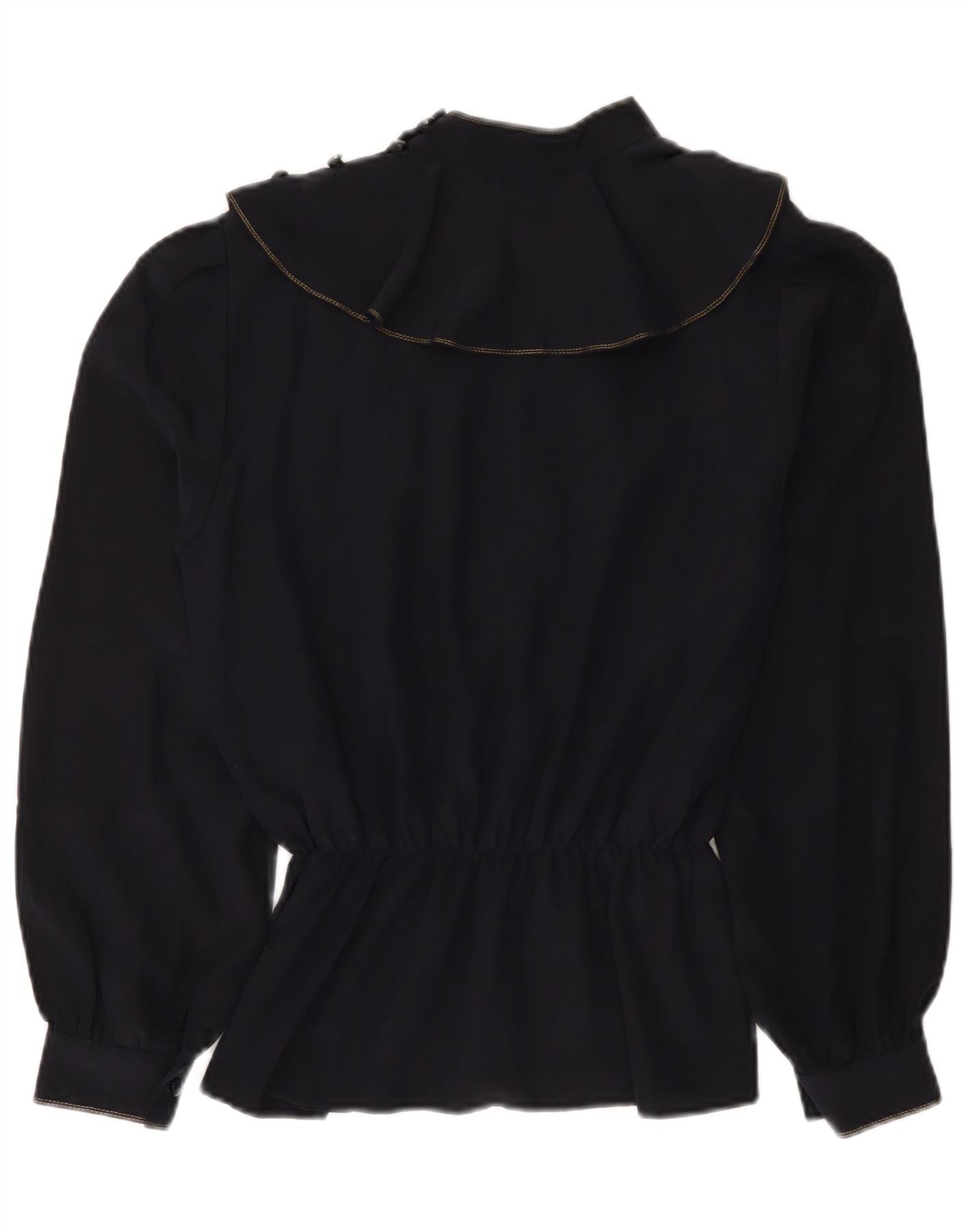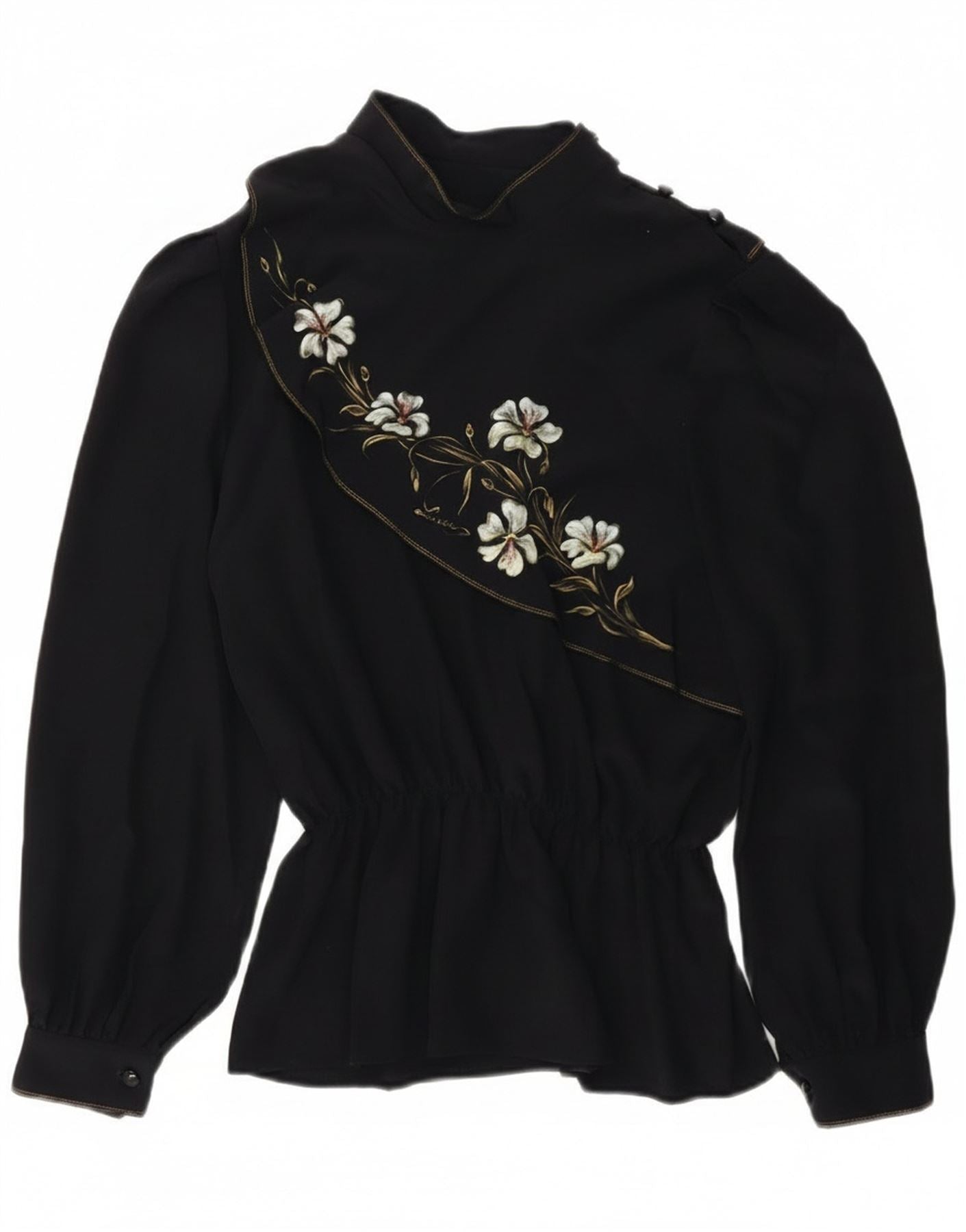 - AI beskrivelse: Denne vintage blusetop for kvinder er lavet af et sort vævet stof. Den har en falsk halsudskæring og lange ærmer med manchetter. Den afslappede pasform går over i en peplum-kant med elastik i taljen. Et elegant broderet blomstermønster pryder fronten og tilføjer et sofistikeret grafisk touch. Knaplukning fuldender designet.