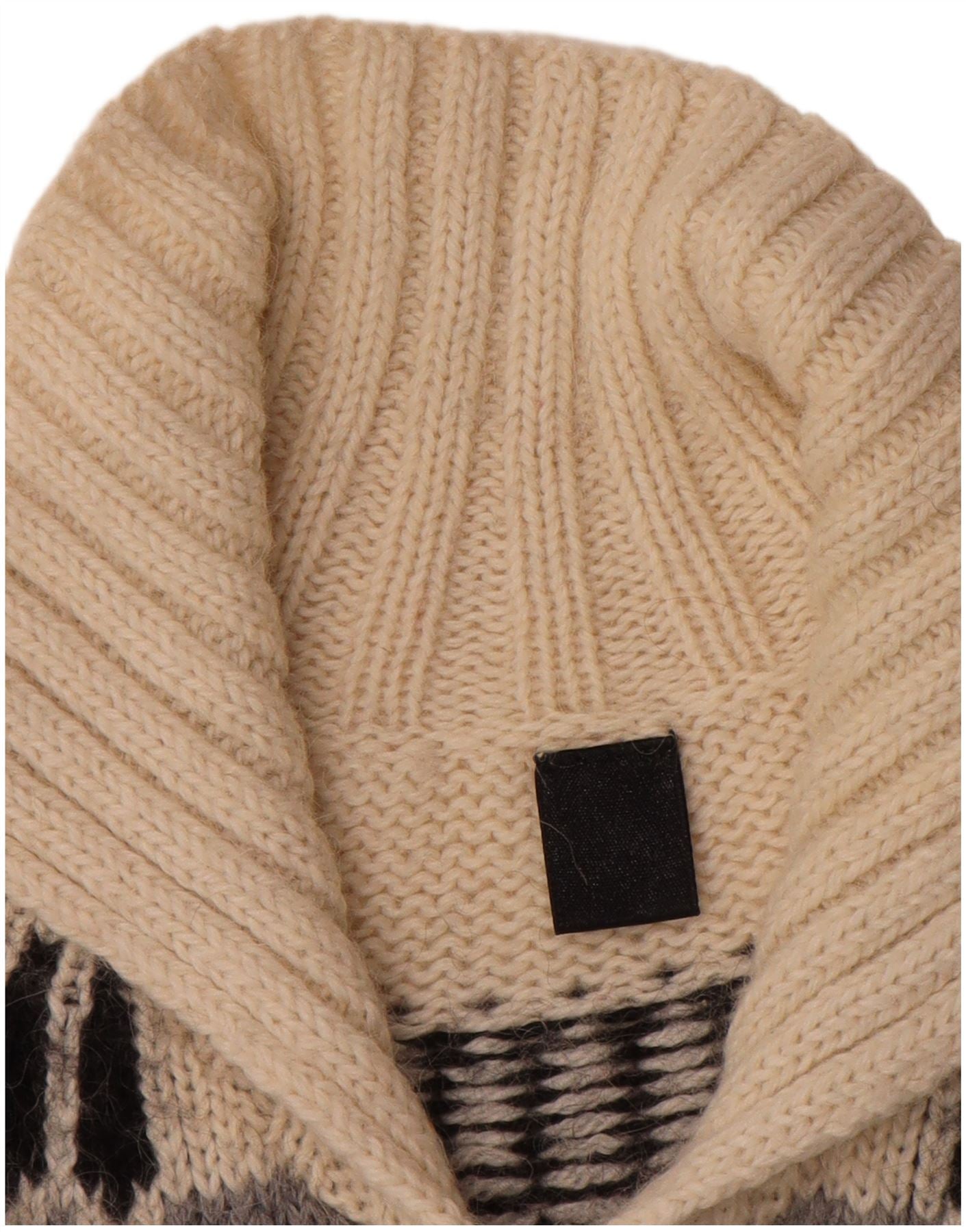 - AI beskrivelse: Denne vintage cardigan sweater til kvinder er lavet af et hyggeligt strikstof. Den har et slående Fair Isle-mønster i sort, råhvid og grå. Sjalhalsen med krave tilføjer et klassisk touch. Lange ærmer har manchetter for komfort. En knap foran med almindelige knapper sikrer den normale pasform. Dette stykke tilbyder varme og traditionel stil.